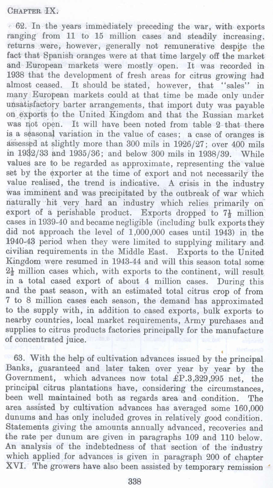 62. In the years immediately preceding the war, with exports ranging from 11 to 15 million cases and steadily increasing. returns were, however, generally not remunerative despite the fact that Spanish oranges were at that time largely off the market and European markets were mostly open. It was recorded in 1938 that the development of fresh areas for citrus growing had almost ceased. It should be stated, however, that "sales" in many European markets could at that time be made only under unsatisfactory barter arrangements, that import duty was payable on exports to the United Kingdom and that the Russian market was not open. It will have been noted from table 2- that there is a seasonal variation in the value of cases; a case of oranges is assessed at slightly more than 300 mils in 1926/27; over 4,00 mils in 1932/33 and 1935/36; and below 300 mils in 1938/39. While values are to be regarded as approximate, representing the value set by the exporter at the time of export and not necessarily the value realised, the trend is indicative. A crisis in the industry was imminent and was precipitated by the outbreak of war which naturally •hit. very bard an industry which relies primarily on' export of a perishable product. Exports dropped to 71/2 million cases in 1939-*10 and became negligible (including bulk exports they did not approach the level of 1,000,000 cases until 1943) in the 1940-43 period when they were limited to supplying military and. civilian requirements in the Middle East. Exports to the United Kingdom were resumed in 1943-44 and will this season total some 2! million cases which, with exports to the continent, will result in a total cased export of about 4 million cases. During this and the past season, with an estimated total citrus crop of from 7 to 8 million cases each season, the demand has approximated to the supply with, in addition to cased exports, bulk exports to nearby countries, local market requirements, Army purchases and supplies to citrus products factories principally for the manufacture of concentrated juice.