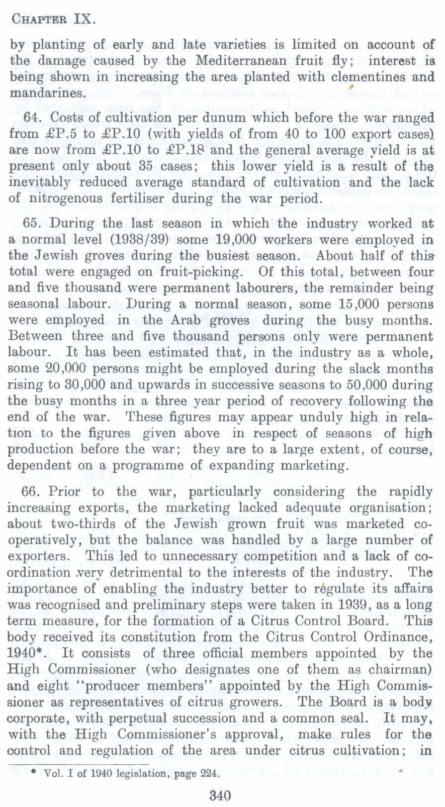 66. Prior to the war, particularly considering the rapidly increasing exports, the marketing lacked adequate organisation ; about two-thirds of the Jewish grown fruit was marketed cooperatively, but the balance was handled by a large number of exporters. This led to unnecessary competition and a lack of coordination .very detrimental to the int.erests of the industry. The importance of enabling the industry better to regulate its affairs was recognised and preliminary steps were taken in 1939, as a long term measure, for the formation of a Citrus Control Board. This body received its constitution from the Citrus Control Ordinance, 1940*. It consists of three official members appointed by the High Commissioner (who designates one of them as chairman) and eight "producer members" appointed by the High Commissioner as representatives of citrus growers. The Board is a body corporate, with perpetual succession and a common seal. It may, with the High Commissioner's approval, make rules for the control and regulation of the area under citrus cultivation; in