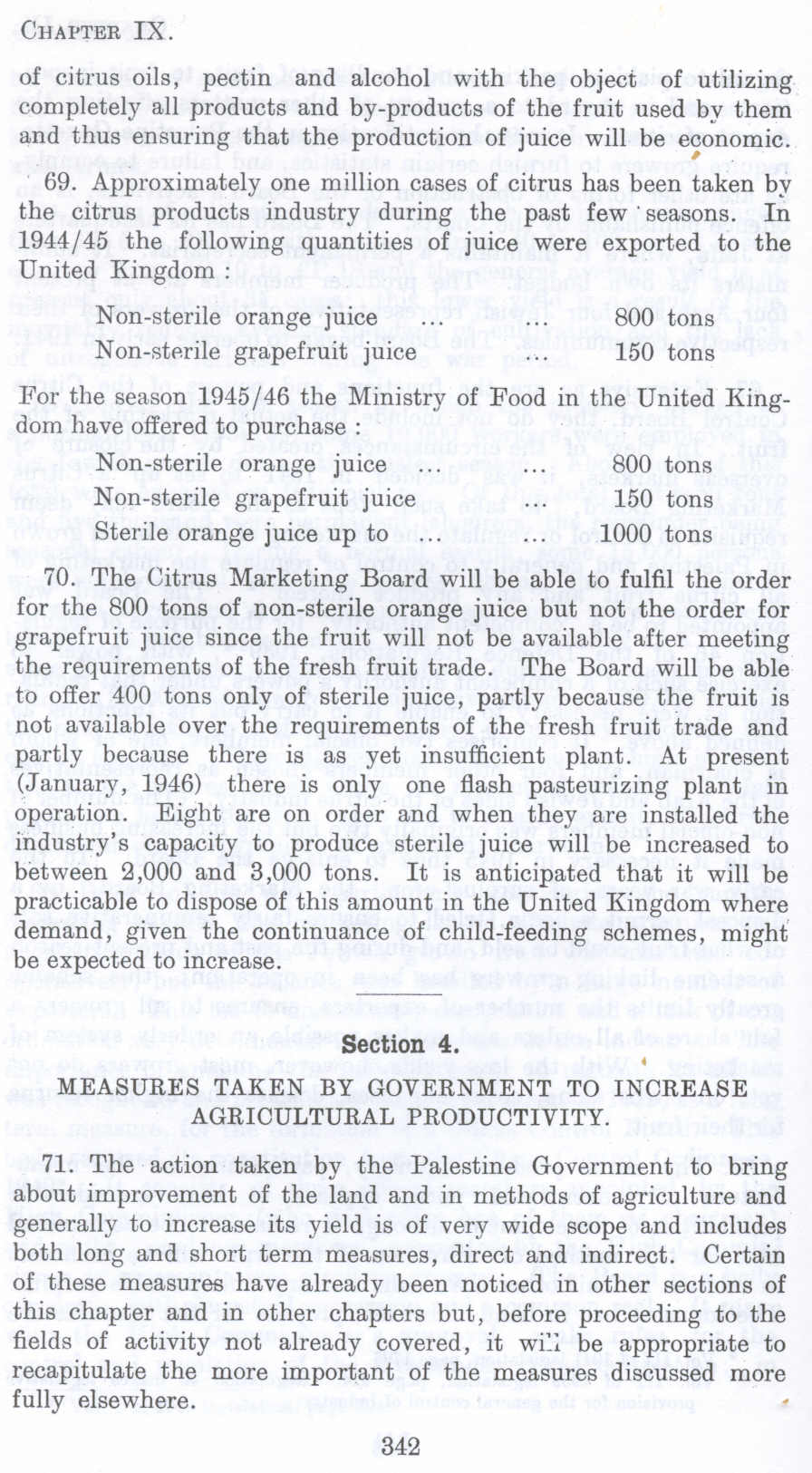 71. The action taken by the Palestine Government to bring about improvement of the land and in methods of agriculture and generally to increase its yield is of very wide scope and includes both long and short term measures, direct and indirect. Certain of these measures have already been noticed in other sections of this chapter and in other chapters but, before proceeding to the fields of activity not already covered, it wi:; be appropriate to recapitulate the more important of the measures discussed more fully elsewhere.