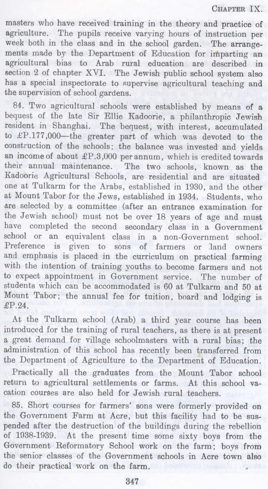 84. Two agricultural schools were established by means of a bequest of the late Sir Ellie Kadoorie , a philanthropic Jewish resident in Shanghai. The bequest, with interest, accumulated to £P.l 77 ,000-the greater part of which was devoted to the construction of the schools; the balance was invested and yields an income of about £P.3,000 per annum, which is credited towards their annual maintenance. The two schools, known as the Kadoorie Agricultural Schools, are residential and are situated one at Tulkarm for the Arabs, established in 1930, and the other at Mount Tabor for the Jews, established in 1934. Students, who are selected by a committee (after an entrance examination for the Jewish school) must not be over 18 years of age and must have completed the second secondary class in a Government school or an equivalent class in a non-Government school. Preference is given to sons of farmers or .land owners and emphasis is placed in the curriculum on practical farming with the intention of training youths to become farmers and not to expect appointment in Government service. The number of students which can be accommodated is 60 at Tulkarm and 50 at Mount Tabor; the annual fee for tuition, board and lodging is £P.24.