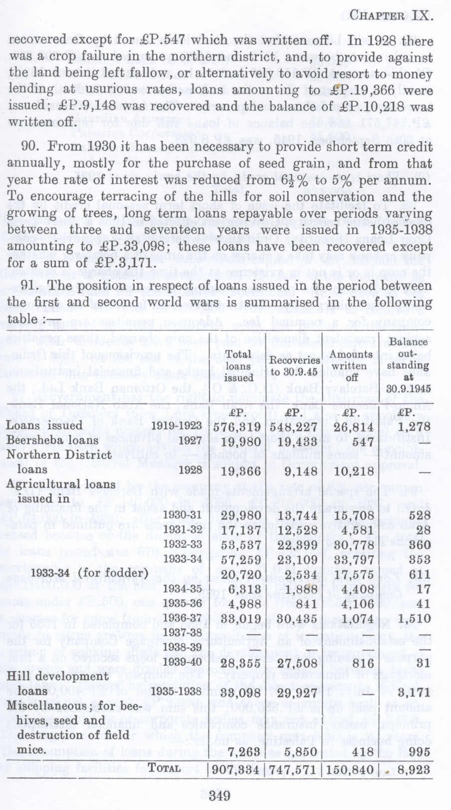 90. From 1930 it has been necessary to provide short term credit annually, mostly for the purchase of seed grain, and from that year the rate of interest was reduced from 6!% to 5% per annum. To encourage terracing of the hills for soil conservation and the growing of trees, long term loans repayable over periods varying between three aud seventeen years were issued in 1935-1938 amounting to £P.33,098; these loans have been recovered except for a sum of £P.3,171.