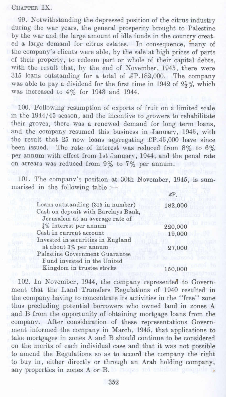 99. Notwithstanding the depressed position of the citrus industry during the war years, the general prosperity brought to Palestine by the war and the large amount of idle funds in the country created a large demand for citrus estates. In consequence, many of the company's clients were able, by the sale at high prices of parts of their property, to redeem part or whole of their capital debts, with the result that, by the end of November, 1945, there were 315 loans outstanding for a total of £P.182,000. The company was able to pay a dividend for the first time in 1942 of 21/2% which was increased to 4 % for 1943 and 1944.
