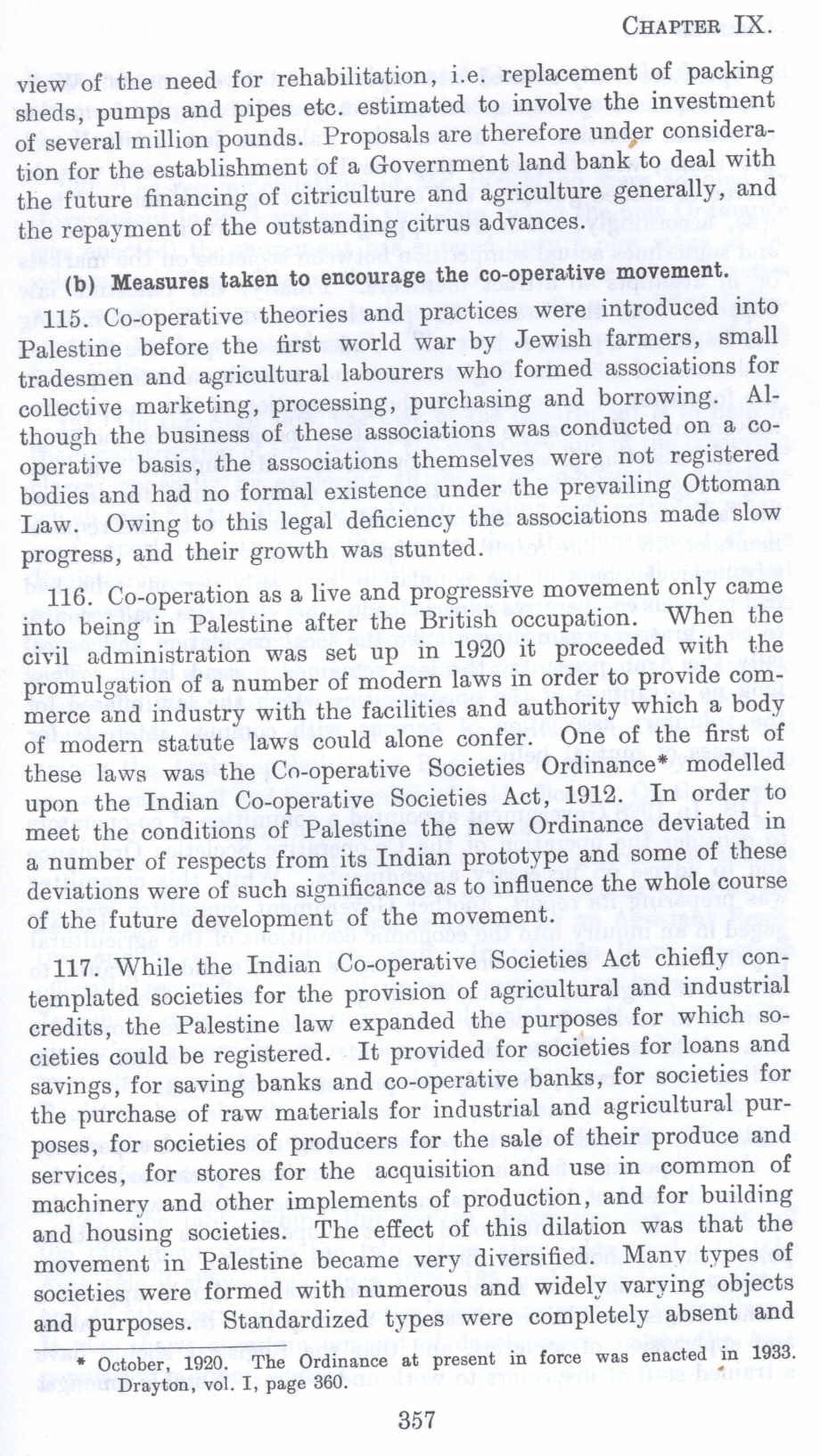 116. Co-operation as a live and progressive movement only came into being in Palestine after the British occupation. When the civil administration was set up in 1920 it proceeded with the promulgation of a number of modern laws in order to provide commerce and industry with the facilities and authority which a body of modern statute laws could alone confer. One of the first of these laws was the Co-operative Societies Ordinance* modeled upon the Indian Co-operative Societies Act, 1912. In order to meet the conditions of Palestine the new Ordinance deviated in a number of respects from its Indian prototype and some of these deviations were of such significance as to influence the whole course of the future development of the movement.