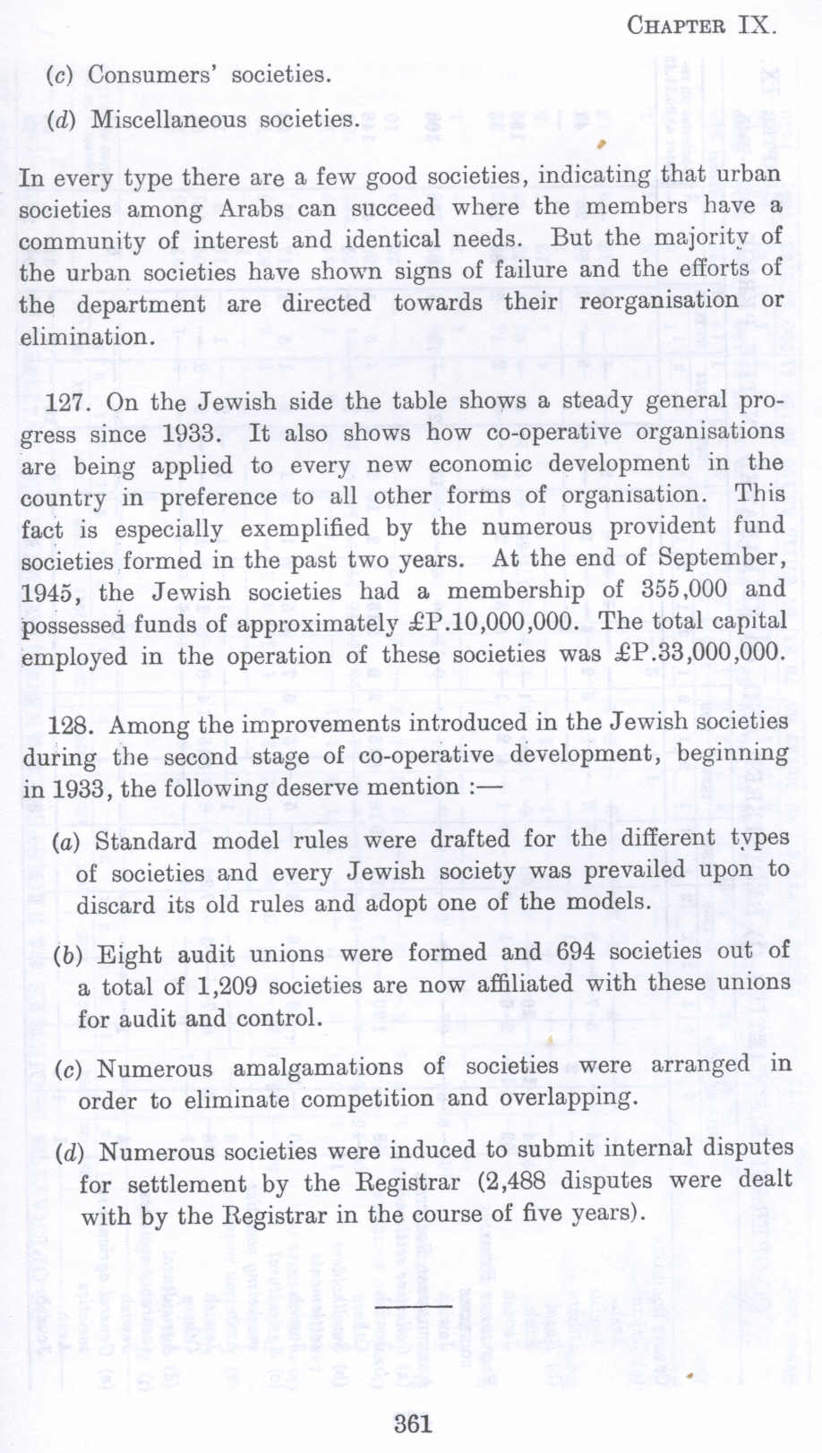 127. On the Jewish side the table shows a steady general progress since 1933. It also shows how co-operative organisations are being applied to every new economic development in the country in preference to all other forms of organisation. This fact is especially exemplified by the numerous provident fund societies formed in the past two years. At the end of September, 1945, the Jewish societies had a. membership of 355,000 and possessed funds of approximately £P.10,000,000. The total capital employed in the operation of these societies was £P.33,000,000.