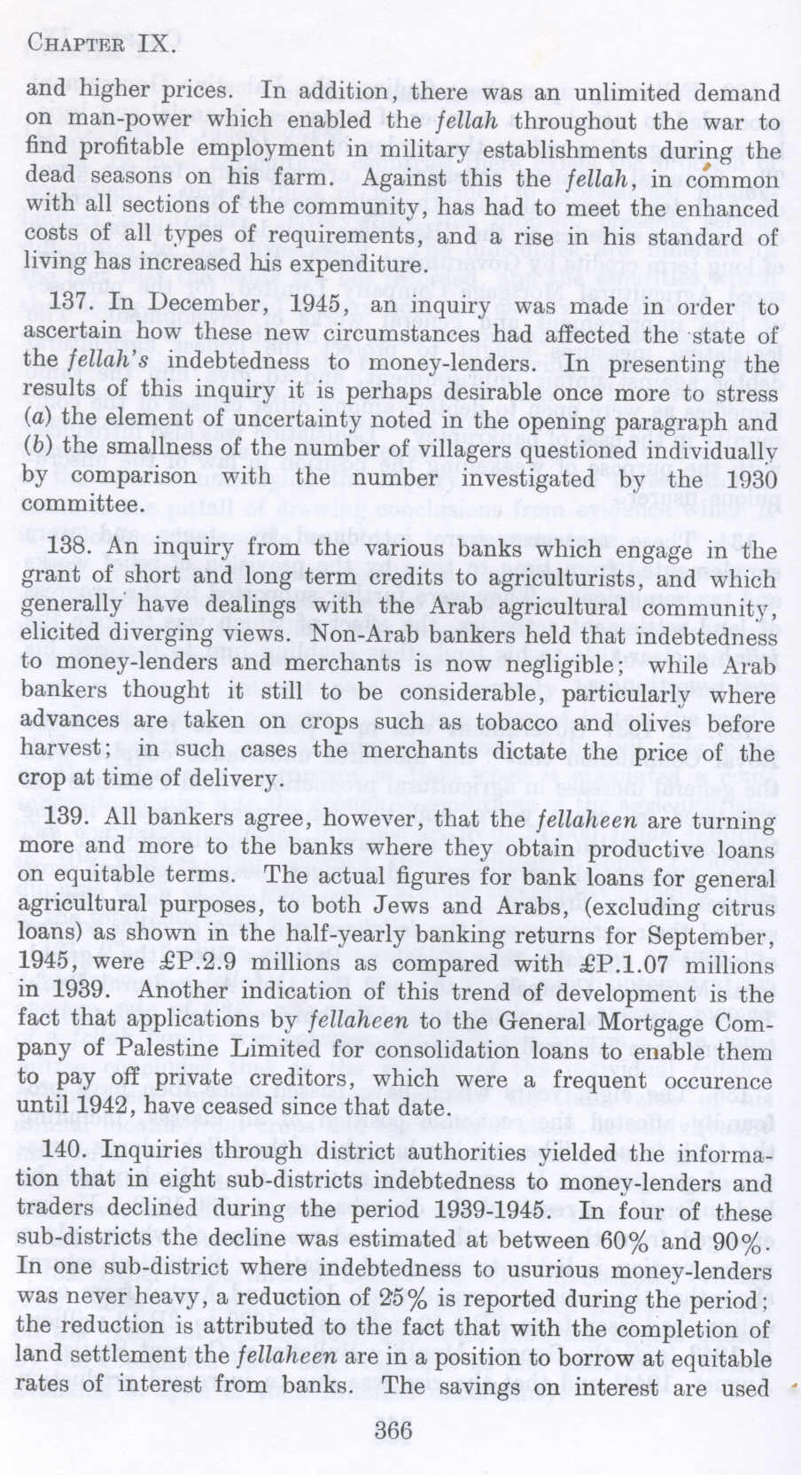 140. Inquiries through district authorities yielded the information that in eight sub-districts indebtedness to money-lenders and traders declined during the period 1939-1945. In four of these sub-districts the decline was estimated at between 60% and 90%. In one sub-district where indebtedness to usurious money-lenders was never heavy, a reduction of 25% is reported during the period; the reduction is attributed to the fact that with the completion of land settlement the fellaheen are in a position to borrow at equitable rates of interest from banks. The savings on interest are used