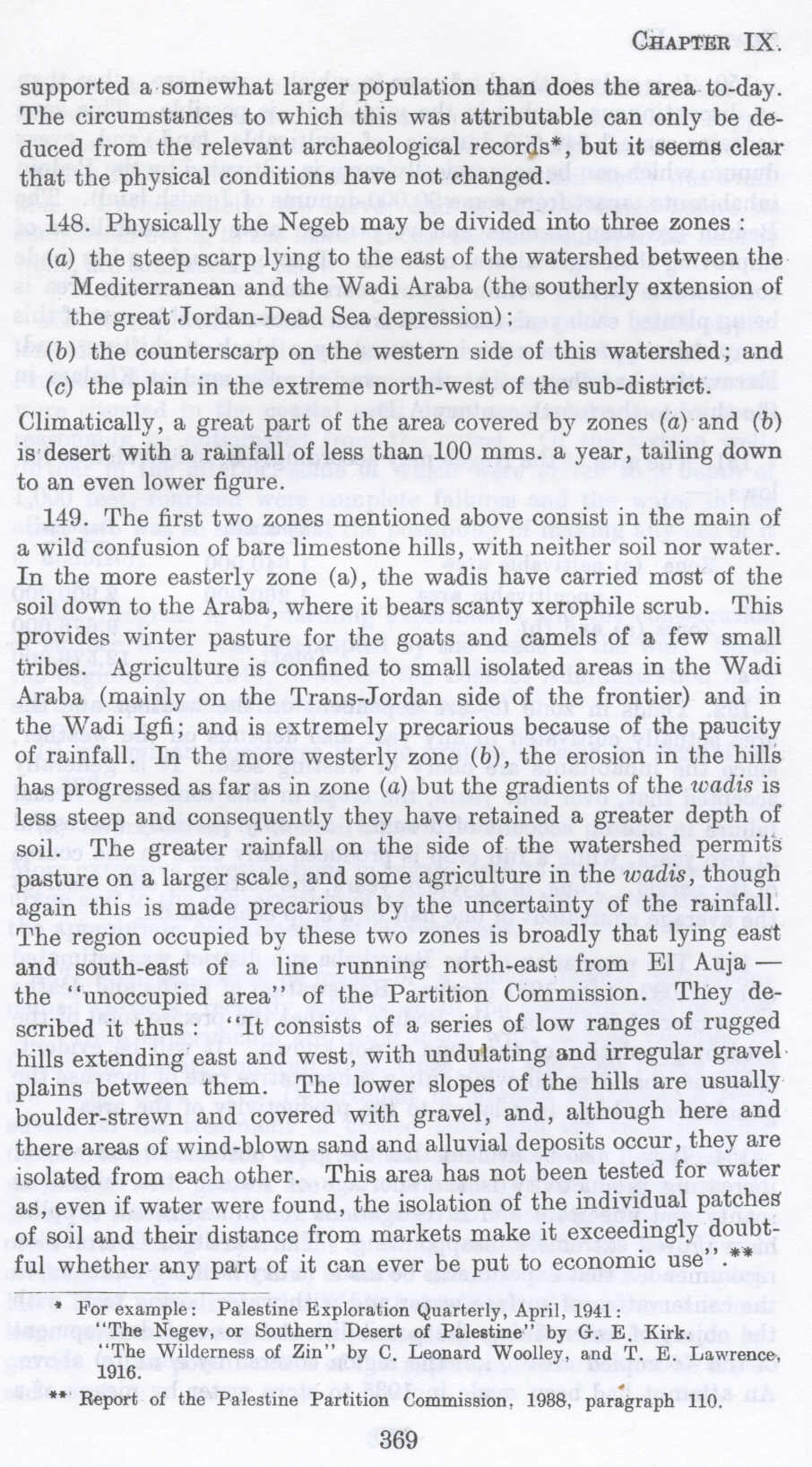 14.9. The first two zones mentioned above consist in the main of a wild confusion of bare limestone hills, with neither soil nor water. In the more easterly zone (a), the wadis have carried most of the soil down to the Araba, where it bears scanty xerophile scrub. This provides winter pasture for the goats and camels of a few small tribes. Agriculture is confined to small isolated areas in the Wadi Araba (mainly on the Trans-Jordan side of the frontier) and in the Wadi Igfi; and is extremely precarious because of the paucity of rainfall. In the more westerly zone (b), the erosion in the hills has progressed as far as in zone (a) but the gradients of the wadis is less steep and consequently they have retained a greater depth of soil. The greater rainfall on the side of the watershed permits pasture on a larger scale, and some agriculture in the wadis, though again this is made precarious by the uncertainty of the rainfall. The region occupied by these two zones is broadly that lying east and south-east of a line running north-east from El Anja - the "unoccupied area" of the Partition Commission. They described it thus : "It consists of a series of low ranges of rugged hills extending east and west, with undulating and irregular gravel• plains between them. The lower slopes of the hills are usually boulder-strewn and covered with gravel, and, although here and there areas of wind-blown sand and alluvial deposits occur, they are isolated from each other. This area has not been tested for water as, even if water were found, the isolation of the individual patches of soil and their distance from markets make it exceedingly doubtful whether any part of it can ever be put to economic use".**