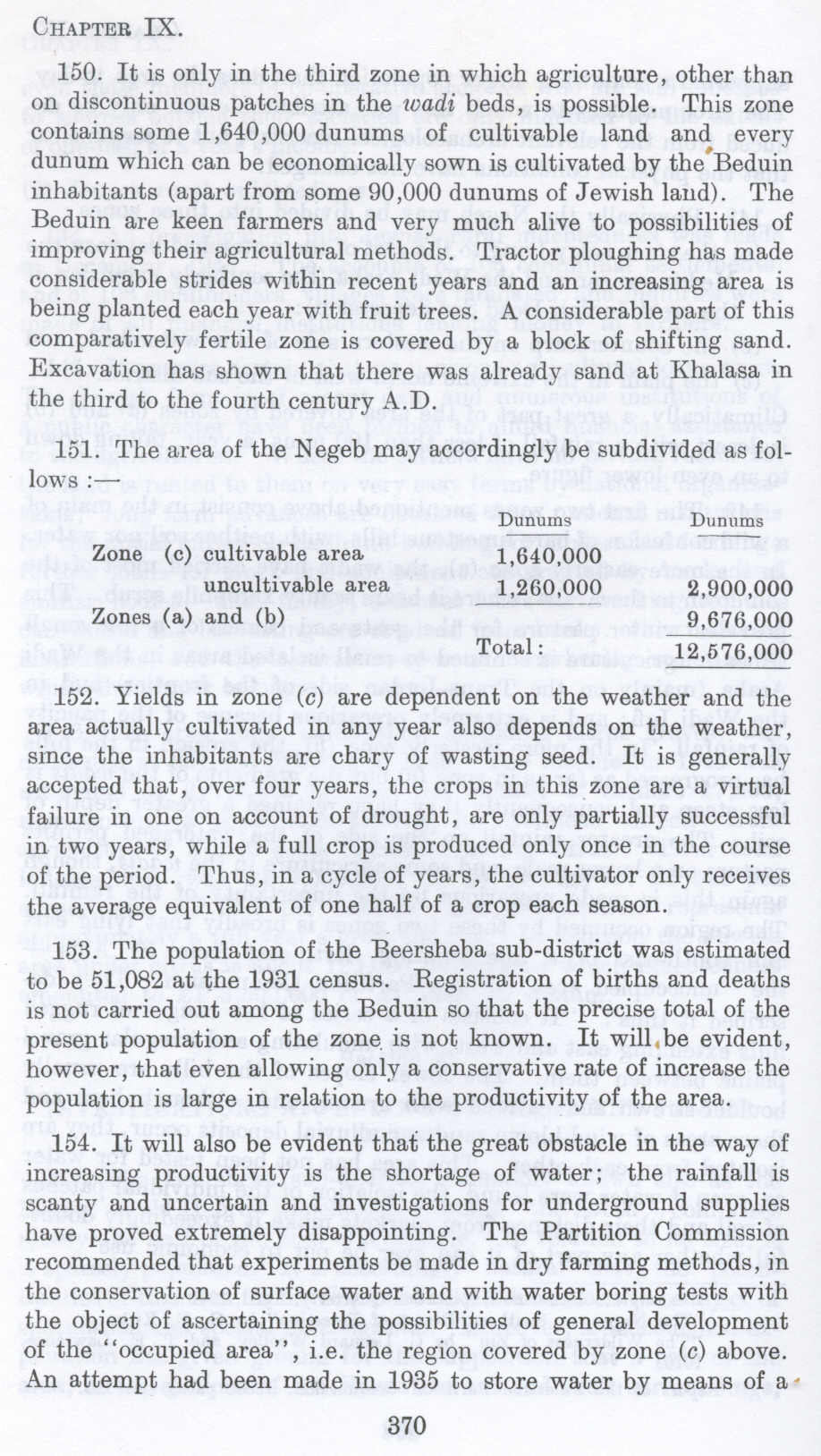154. It will also be evident that the great obstacle in the way of increasing productivity jg the shortage of water; the rainfall is scanty and uncertain and investigations for underground supplies have proved extremely disappointing. The Partition Commission recommended that experiments be made in dry farming methods, in the conservation of surface water and with water boring tests with the object of ascertaining the possibilities of general development of the "occupied area", i.e. the region covered by zone (c) above. An attempt had been made in 1935 to store water by means of a