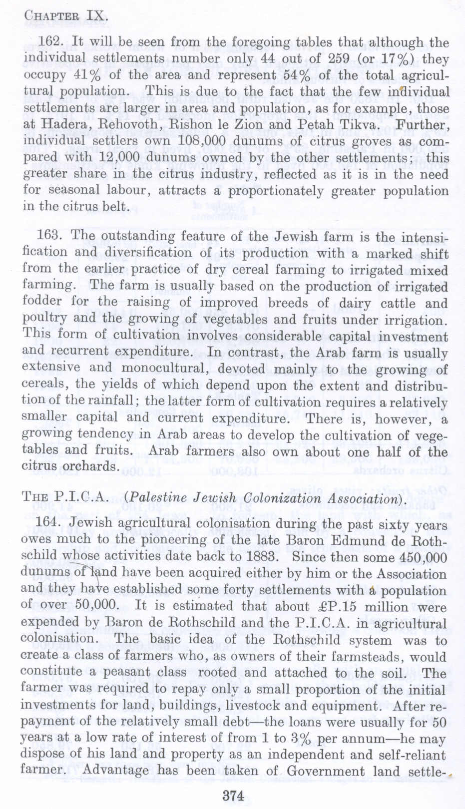 162. It will be seen from the foregoing tables that although the individual settlements number only 44 out of 259 (or 17%) they occupy 41 % of the area and represent 54% of the total agricultural population. This is due to the fact that the few individual settlements are larger in area and population, as for example, those at Hadera, Rehovoth, Rishon le Zion and Petah Tikva. Further, individual settlers own 108,000 dunums of citrus groves as compared with 12,000 dunums owned by the other settlements; this greater share in the citrus industry, reflected as it is in the need for seasonal labour, attracts a proportionately greater population in the citrus belt.