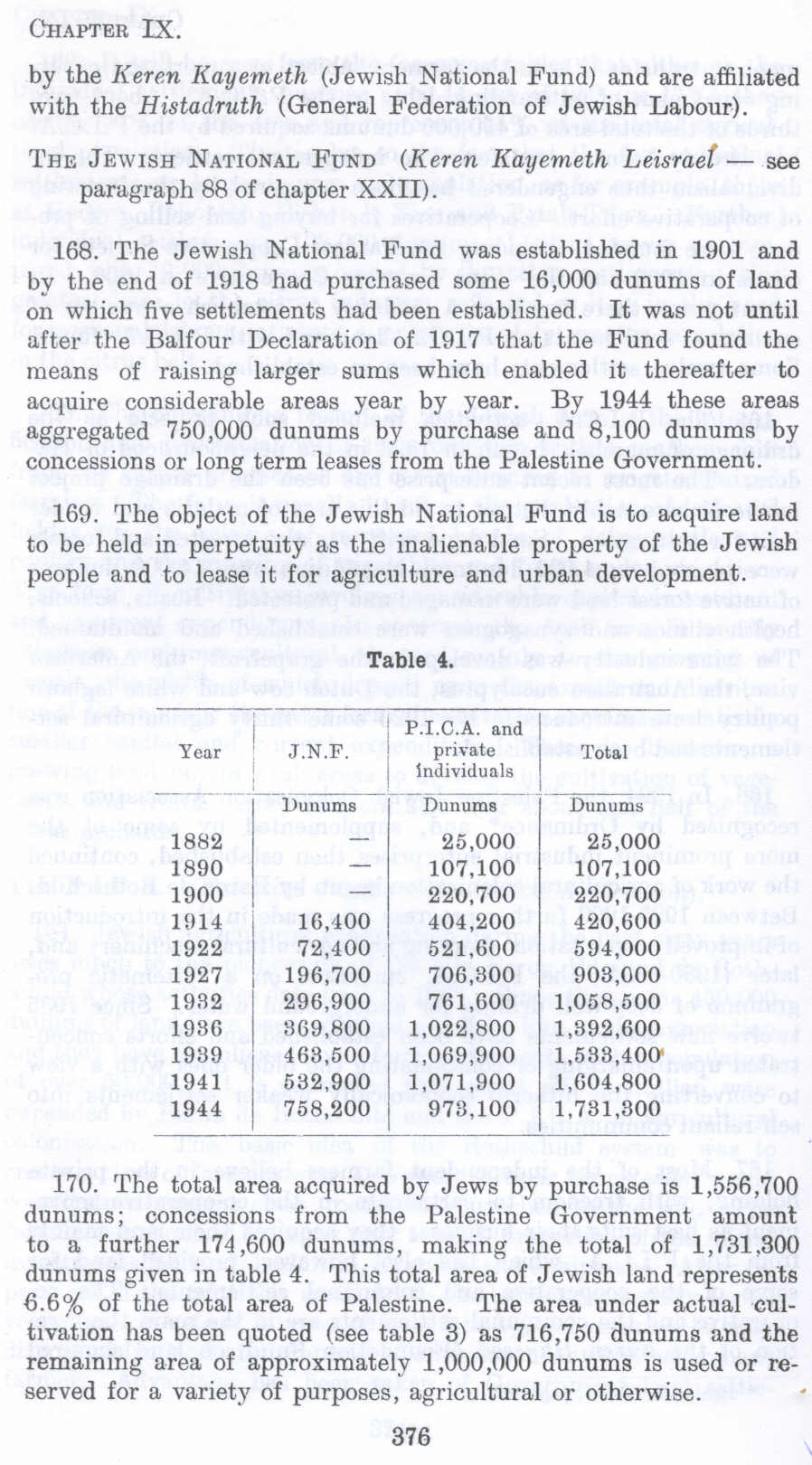 170. The total area acquired by Jews by purchase is 1,556,700 dunums; concessions from the Palestine Government amount to a further 174,600 dunums, making the total of 1,731,300 dunums given in table 4. This total area of Jewish land represents 6.6% of the total area of Palestine. The area under actual cultivation has been quoted (see table 3) as 716,750 dunums and the remaining area of approximately 1,000,000 dunums is used or reserved for a variety of purposes, agricultural or otherwise.