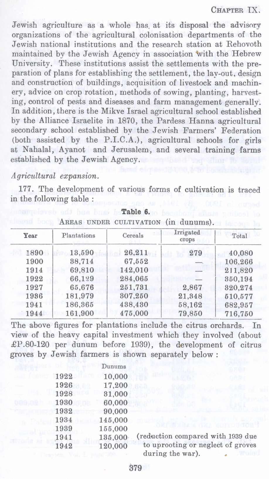 The above figures for plantations include the citrus orchards. In view of the heavy capital investment which they involved (about £P.80-120 per dunum before 1039), the development of citrus groves by Jewish farmers is shown separately below :