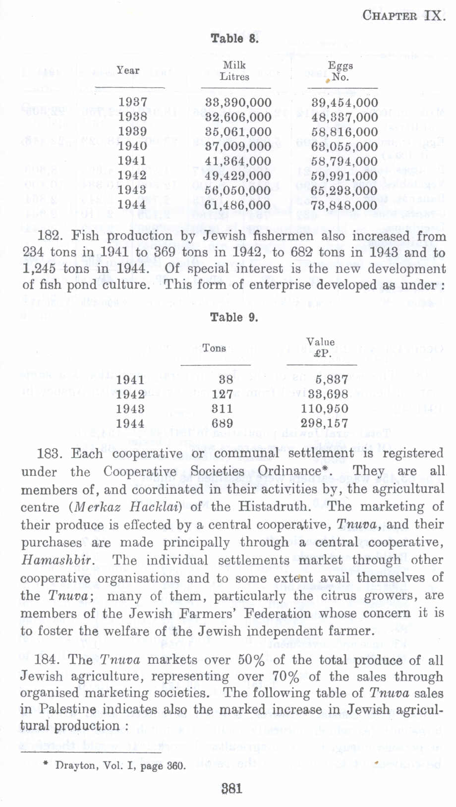 184. The Tnuva markets over 50% of the total produce of all Jewish agriculture, representing over 70% of the sales through organised marketing societies. The following table of Tnuva sales in Palestine indicates also the marked increase in Jewish agricultural production :