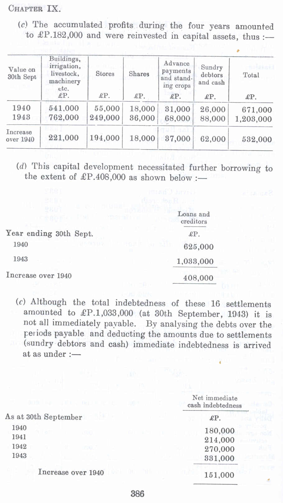(c) Although the total indebtedness of these 16 settlements amounted to £P.l,033,000 (at 30th September, 1()43) it is not all immediately payable. By analysing the debts over the periods payable and deducting the amounts due to settlements (sundry debtors and cash) immediate indebtedness is arrived at as under :-