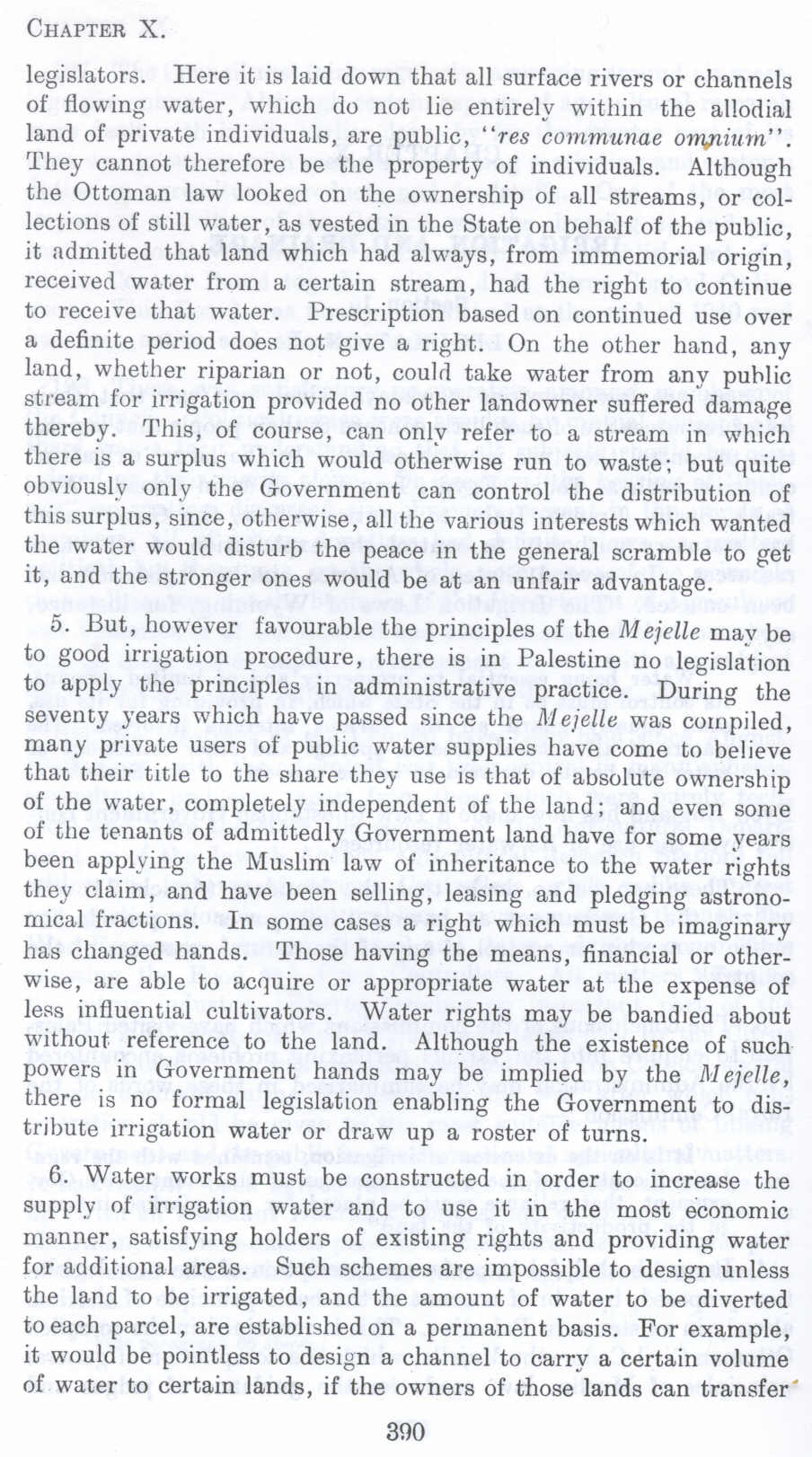 legislators. Here it is laid down that all surface rivers or channels of flowing water, which do not lie entirely within the allodial land of private individuals, are public, "res commune omnium". They cannot therefore be the property of individuals. Although the Ottoman law looked on the ownership of all streams, or collections of still water, as vested in the State on behalf of the public, it admitted that land which had always, from immemorial origin, received water from a certain stream, bad the right to continue to receive that water. Prescription has ed on continued use over a definite period does not give a right. On the other hand, any land, whether riparian or not, could take water from any public stream for irrigation provided no other landowner suffered damage thereby. This, of course, can only refer to a stream in which there is a surplus which would otherwise run to waste; but quite obviously only the Government can control the distribution of this surplus, since, otherwise, all the various interests which wanted the water would disturb the peace in the general scramble to get it, and the stronger ones would be at an unfair advantage.