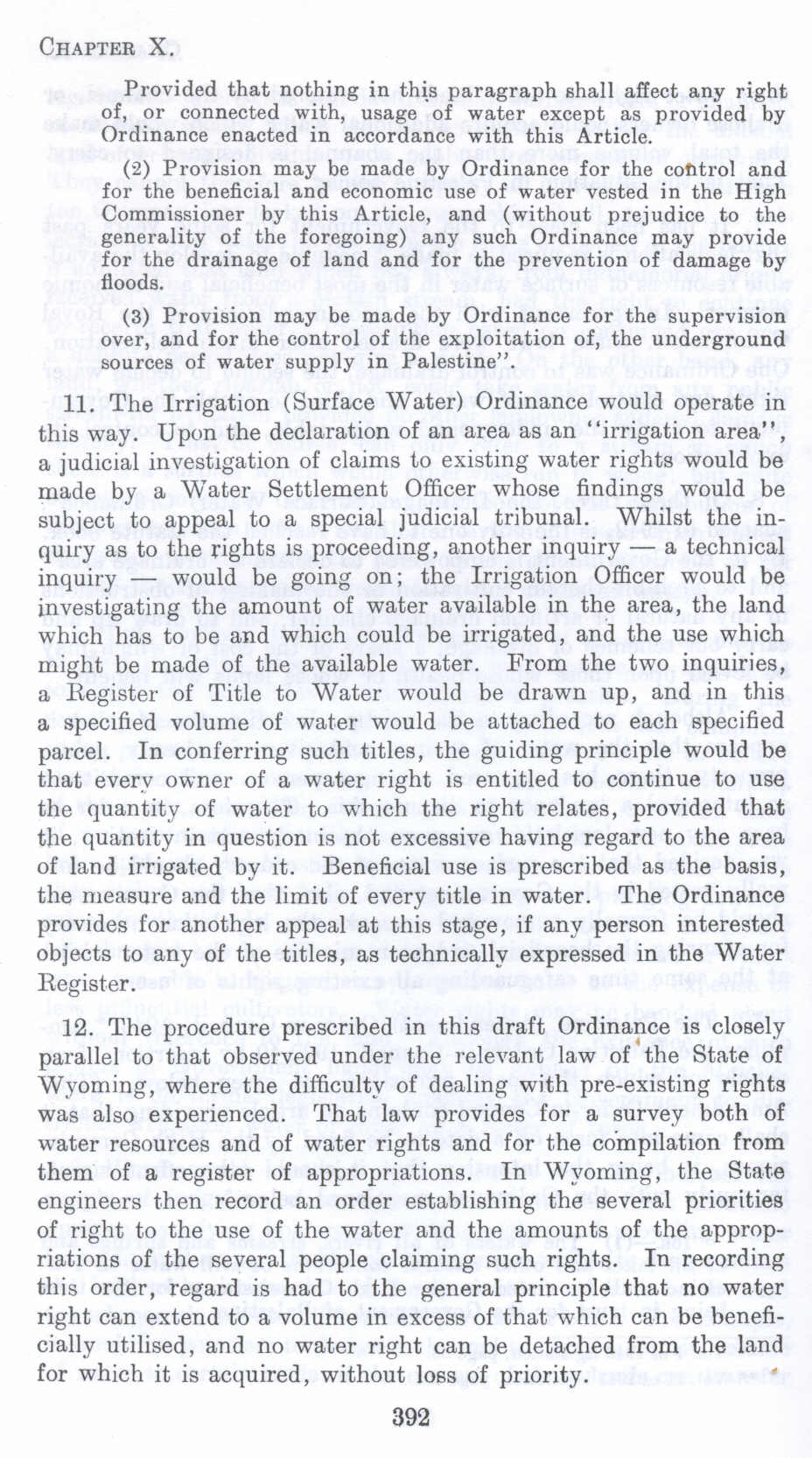 12. The procedure prescribed in this draft Ordinance is closely parallel to that observed under the relevant law of' the State of Wyoming, where the difficulty of dealing with pre-existing rights was also experienced. That law provides for a survey both of water resources and of water rights and for the compilation from them of a register of appropriations. In Wyoming, the State engineers then record an order establishing the several priorities of right to the use of the water and the amounts of the appropriations of the several people claiming such rights. In recording this order, regard is had to the general principle that no water right can extend to a volume in excess of that which can be beneficially utilised, and no water right can be detached from the land for which it is acquired, without loss of priority.