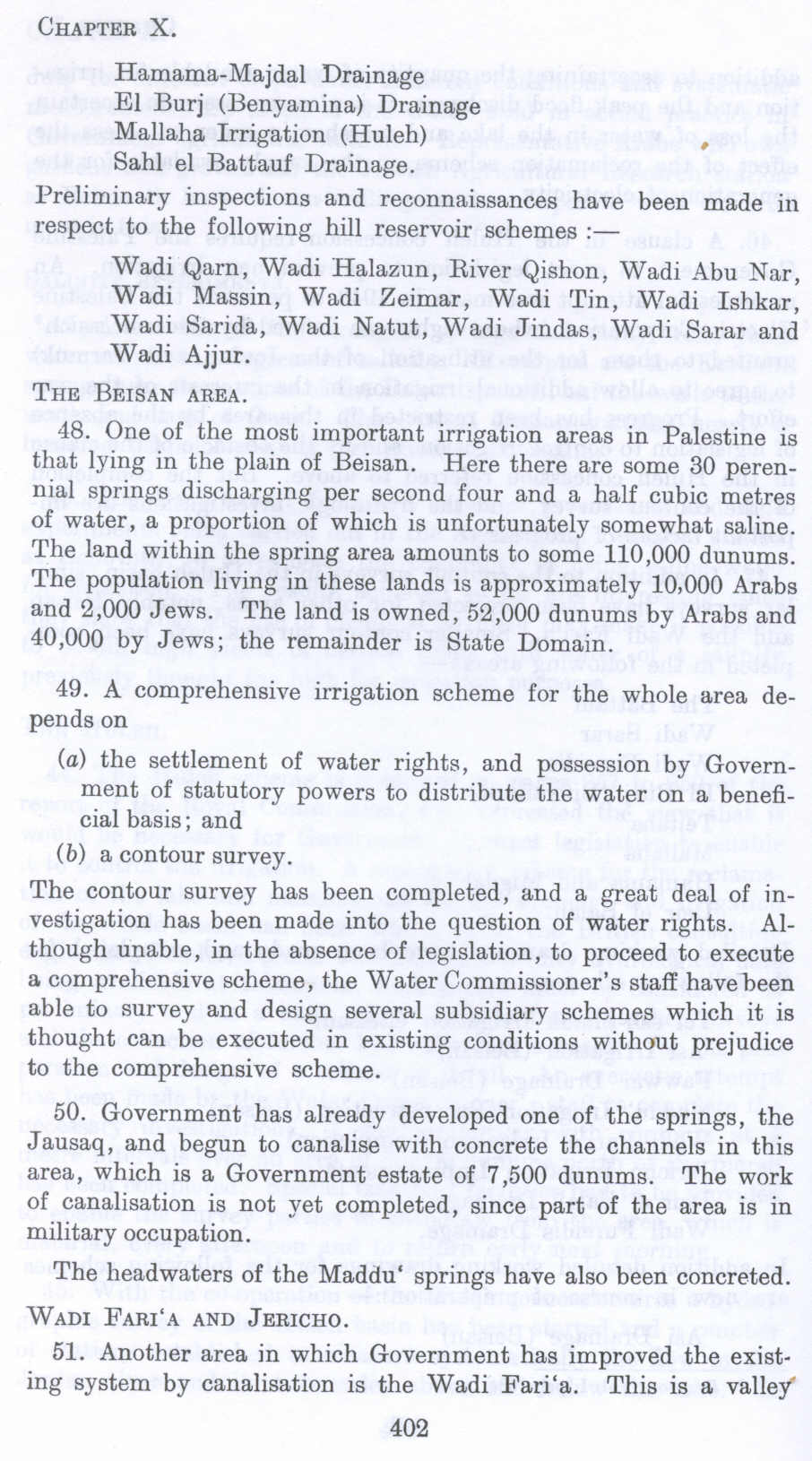 48. One of the most important irrigation areas in Palestine is that lying in the plain of Beisan. Here there are some 30 perennial springs discharging per second four and a half cubic metres of water, a proportion of which is unfortunately somewhat saline. The land within the spring area amounts to some 110,000 dunums. The population living in these lands is approximately 10,000 Arabs and 2,000 Jews. The land is owned, 52,000 dunums by Arabs and 40 ,000 by Jews; the remainder is State Domain.