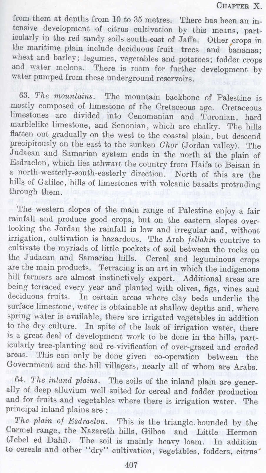 from them at depths from 10 to 35 metres. There has been an intensive development of citrus cultivation by this means, particularly in the red sandy soils south-east of Jaffa. Other, crops in the maritime plain include deciduous fruit trees and bananas; wheat and barley; legumes, vegetables and potatoes; fodder crops and water melons. There is room for further development by water pumped from these underground reservoirs.