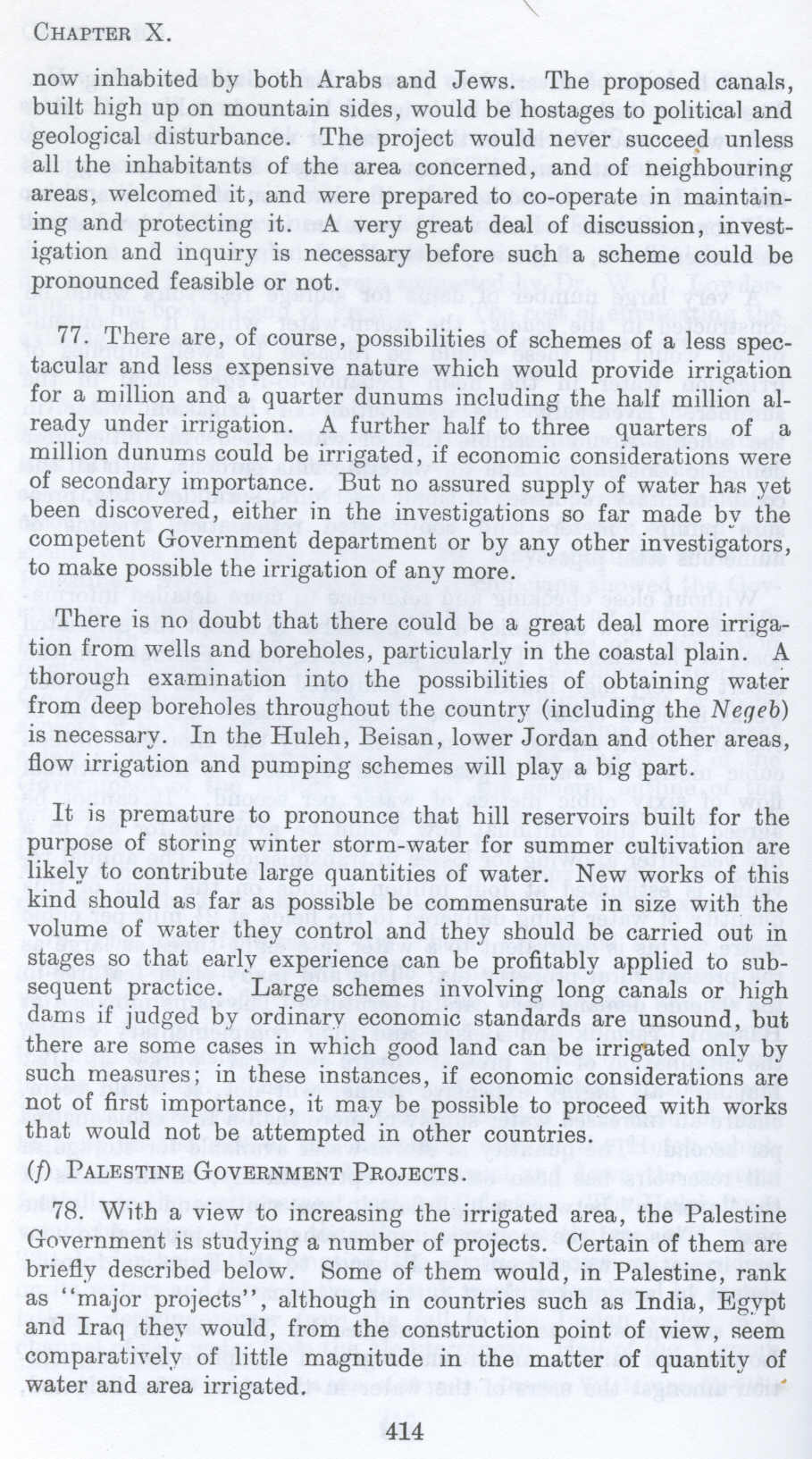 77. There are, of course, possibilities of schemes of a less spectacular and less expensive nature which would provide irrigation for a million and a quarter dunums including the half million already under irrigation. A further half to three quarters of a million dunums could be irrigated, if economic considerations were of secondary importance. But no assured supply of water has yet been discovered, either in the investigations so far made by the competent Government department or by any other investigators, to make possible the irrigation of any more.