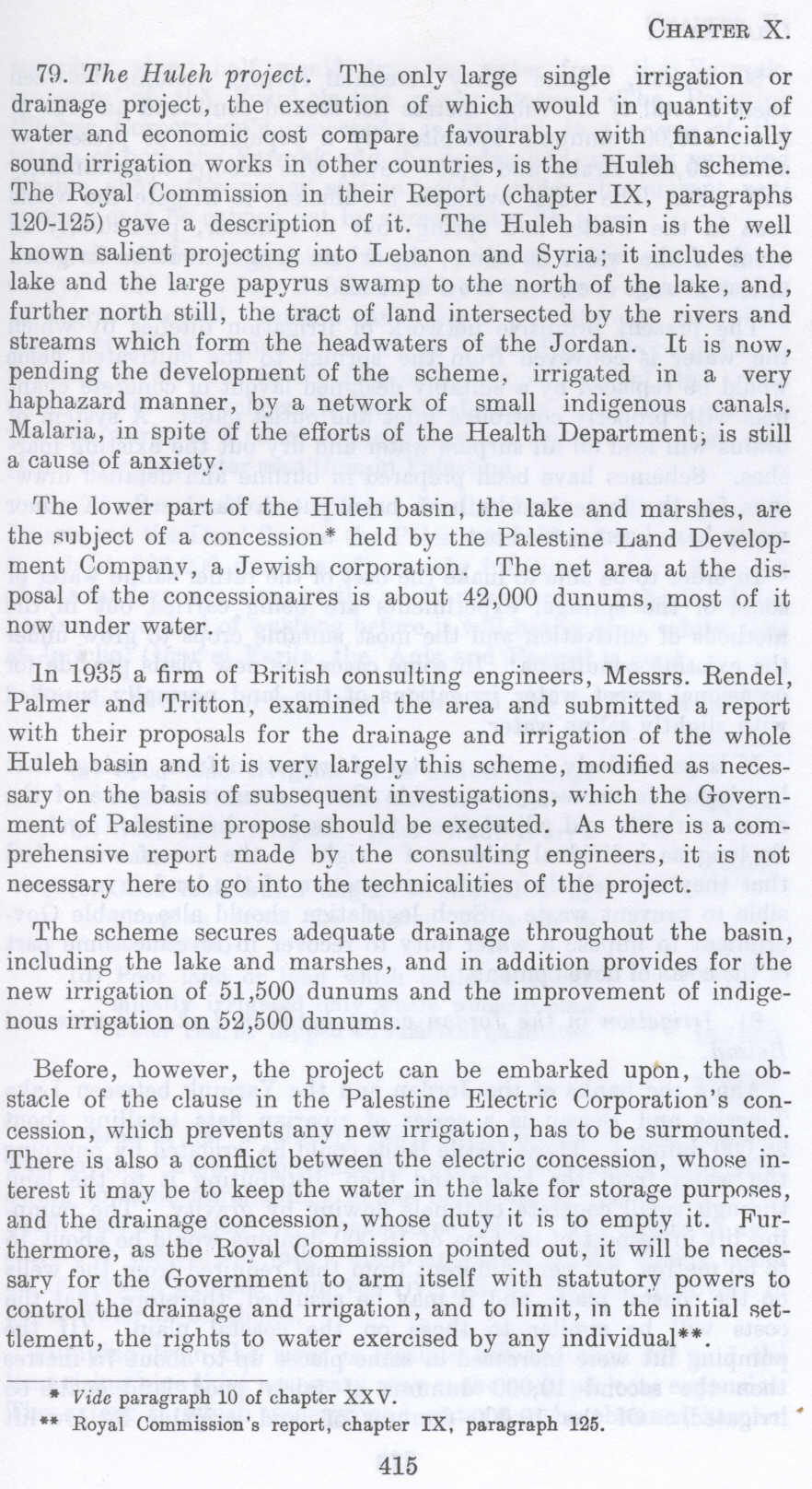 Before, however, the project can be embarked upon, the obstacle of the clause in the Palestine Electric Corporation's concession, which prevents any new irrigation, has to be surmounted. There is also a conflict between the electric concession, whose interest it may be to keep the water in the lake for storage purposes, and the drainage concession, whose duty it is to empty it. Furthermore, as the Royal Commission pointed out, it will be necessary for the Government to arm itself with statutory powers to control the drainage and irrigation, and to limit, in the initial settlement, the rights to water exercised by any individual **.