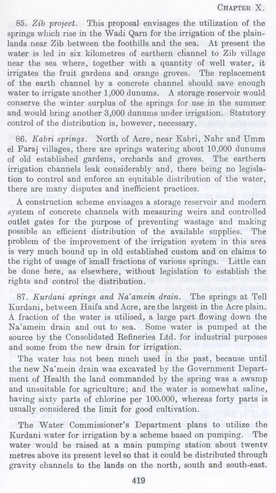 85. Zib project. This proposal envisages the utilization of the springs which rise in the Wadi Qarn for the irrigation of the plainlands near Zib between the foothills and the sea. At present the water is led in six kilometres of earthern channel to Zib village near the sea where, together with a quantity of well water, it irrigates the fruit gardens and orange groves. The replacement of the earth channel by a concrete channel should save enough water to irrigate another 1,000 dunums. A storage reservoir would conserve the winter surplus of the springs for use in the summer and would bring another 3,000 dunums under irrigation. Statutory control of the distribution is, however, necessary.