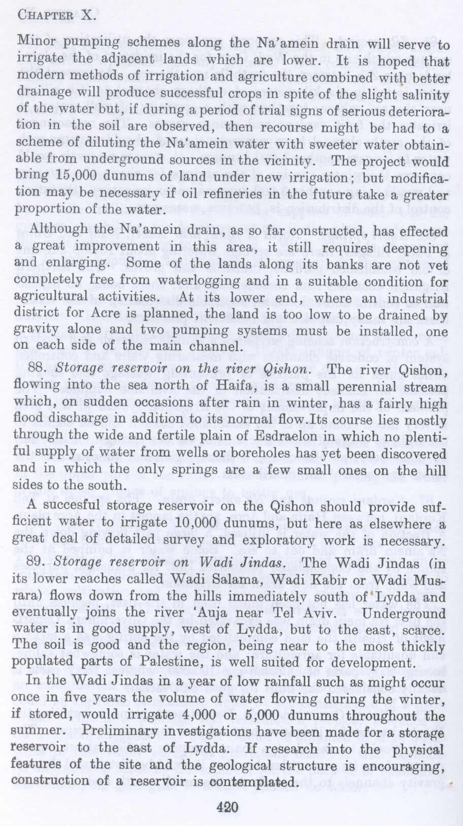 89. Storage reservoir on Wadi Jindas. The Wadi Jindas (in its lower reaches called Wadi Salama, Wadi Kabir or Wadi Musrara) flows down from the bills immediately south of'Lydda and eventually joins the river 'Awja near Tel Aviv. Underground water is in good supply, west of Lydda, but to the east, scarce. The soil is good and the region, being near to the most thickly populated parts of Palestine, is well suited for development.