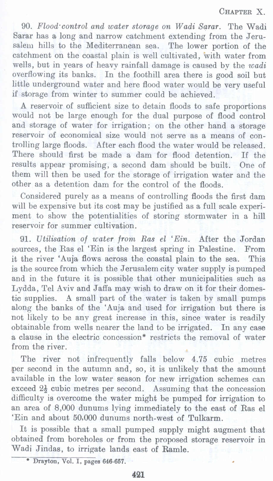 91. Utilisation of water from Ras el 'Ein. After the Jordan sources, the Ras el 'Ein is the largest spring in Palestine. From it the river 'Auja flows across the coastal plain to the sea. This is the source from which the Jerusalem city water supply is pumped and in the future it is possible that other municipalities such as Lydda, Tel Aviv and Jaffa may wish to draw on it for their domestic supplies. A small part of the water is taken by small pumps along the banks of the 'Auja and used for irrigation but there is not likely to be any great increase in this, since water is readily obtainable from wells nearer the land to be irrigated. In any case a clause in the electric concession" restricts the removal of water from the river.