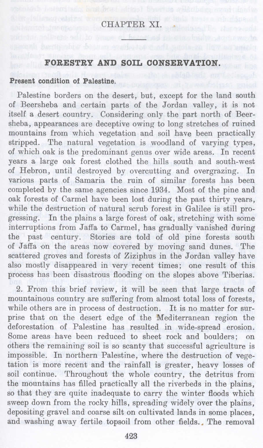 2. From this brief review, it will be seen that large tracts of mountainous country are suffering from almost total loss of forests, while others are in process of destruction. It is no matter for surprise that on the desert edge of the Mediterranean region the deforestation of Palestine has resulted in wide-spread erosion. Some areas have been reduced to sheet rock and boulders; on others the remaining soil is so scanty that successful agriculture is impossible. In northern Palestine, where the destruction of vegetation is more recent and the rainfall is greater, heavy losses of soil continue. Throughout the whole country, the detritus from the mountains has filled practically all the riverbeds in the plains, so that they are quite inadequate to carry the winter floods which sweep down from the rocky hills, spreading widely over the plains, depositing gravel and coarse silt on cultivated lands in some places, and washing away fertile topsoil from other fields . The removal