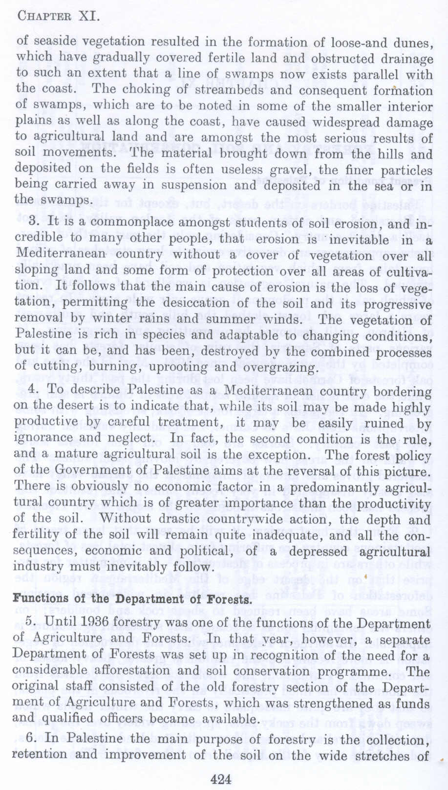 4. To describe Palestine as a Mediterranean country bordering on the desert is to indicate that, while its soil may be made highly productive by careful treatment, it may be easily ruined by ignorance and neglect. In fact, the second condition is the rule, and a mature agricultural sol! is the exception. The forest policy of the Government of Palestine aims a.t the reversal of this picture. There is obviously no economic factor in a predominantly agricultural country which is of greater importance than the productivity of the soil. Without drastic countrywide action, the depth and fertility of the soil will remain quite inadequate, and all the consequences, economic and political, of a depressed agricultural industry must inevitably follow.