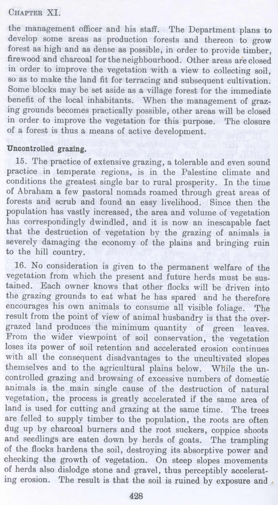 15. The practice of extensive grazing, a tolerable and even sound practice in temperate regions, is in the Palestine climate and conditions the greatest single bar to rural prosperity. In the time of Abraham a few pastoral nomads roamed through great areas of forests and scrub and found an easy livelihood. Since then the population has vastly increased, the area and volume of vegetation has correspondingly dwindled, and it is now an inescapable fact that the destruction of vegetation by the grazing of animals is severely damaging the economy of the plains and bringing ruin to the bill country.