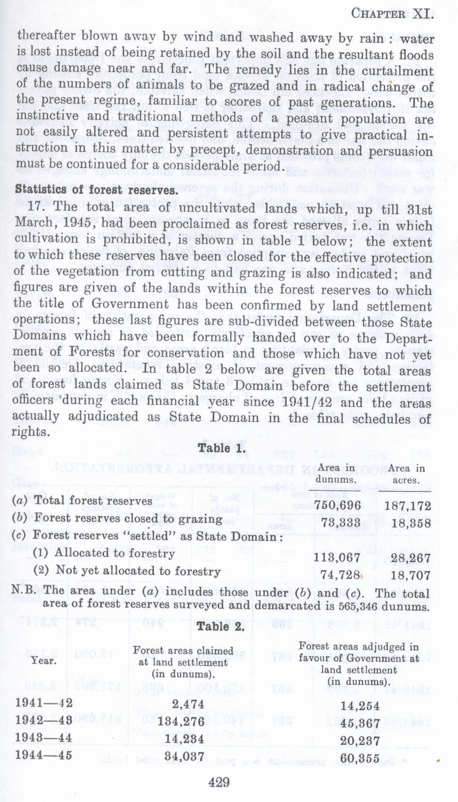 17. The total area of uncultivated lands which, up till 31st March, 1945, bad been proclaimed as forest reserves, i.e. in which cultivation is prohibited, is shown in table 1 below; the extent to which these reserves have been closed for the effective protection of the vegetation from cutting and grazing is also indicated; and figures are given of the lands within the forest reserves to which the title of Government has been confirmed by land settlement operations; these last figures are sub-divided between those State Domains which have been formally handed over to the Department of Forests for conservation and those which have not vet been so allocated. In table 2 below are given the total areas of forest lands claimed as State Domain before the settlement officers 'during each financial year since 1941/.12 and the areas actually adjudicated as State Domain in the final schedules of rights.