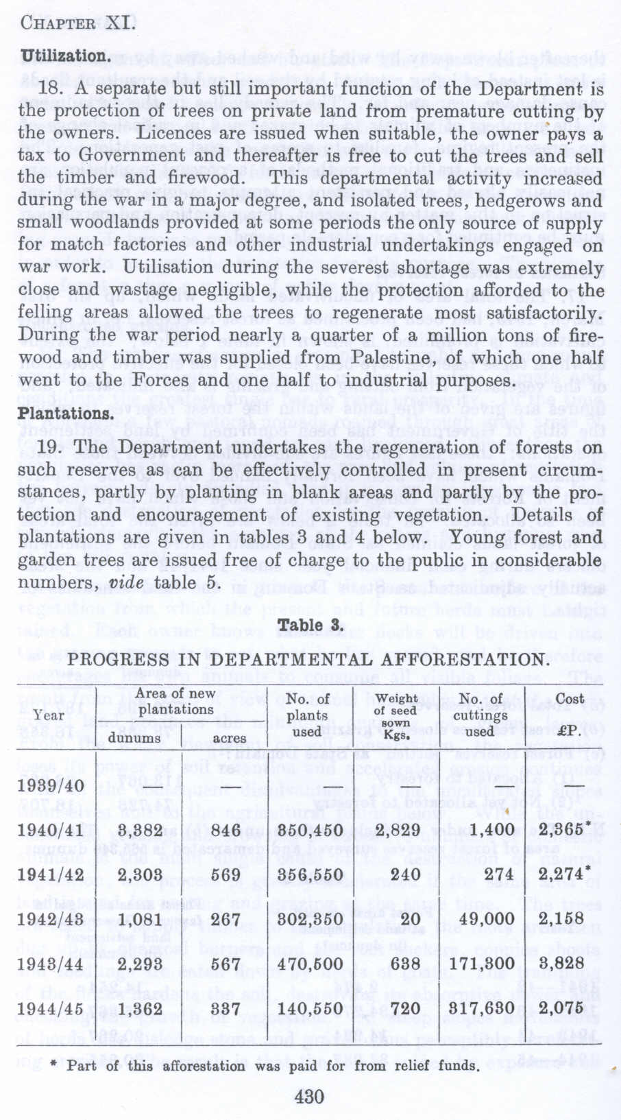18. A separate but still important function of the Department is the protection of trees on private land from premature cutting by the owners. Licences are issued when suitable, the owner pays ~ tax to Government and thereafter is free to cut the trees and sell the timber and firewood. This departmental activity increased during the war in a major degree, and isolated trees, hedgerows and small woodlands provided at some periods the only source of supply for match factories and other industrial undertakings engaged on war work. Utilisation during the severest shortage was extremely close and wastage negligible, while the protection afforded to the felling areas allowed the trees to regenerate most satisfactorily. During the war period nearly a quarter of a million tons of firewood and timber was supplied from Palestine, of which one half went to the Forces and one half to industrial purposes.