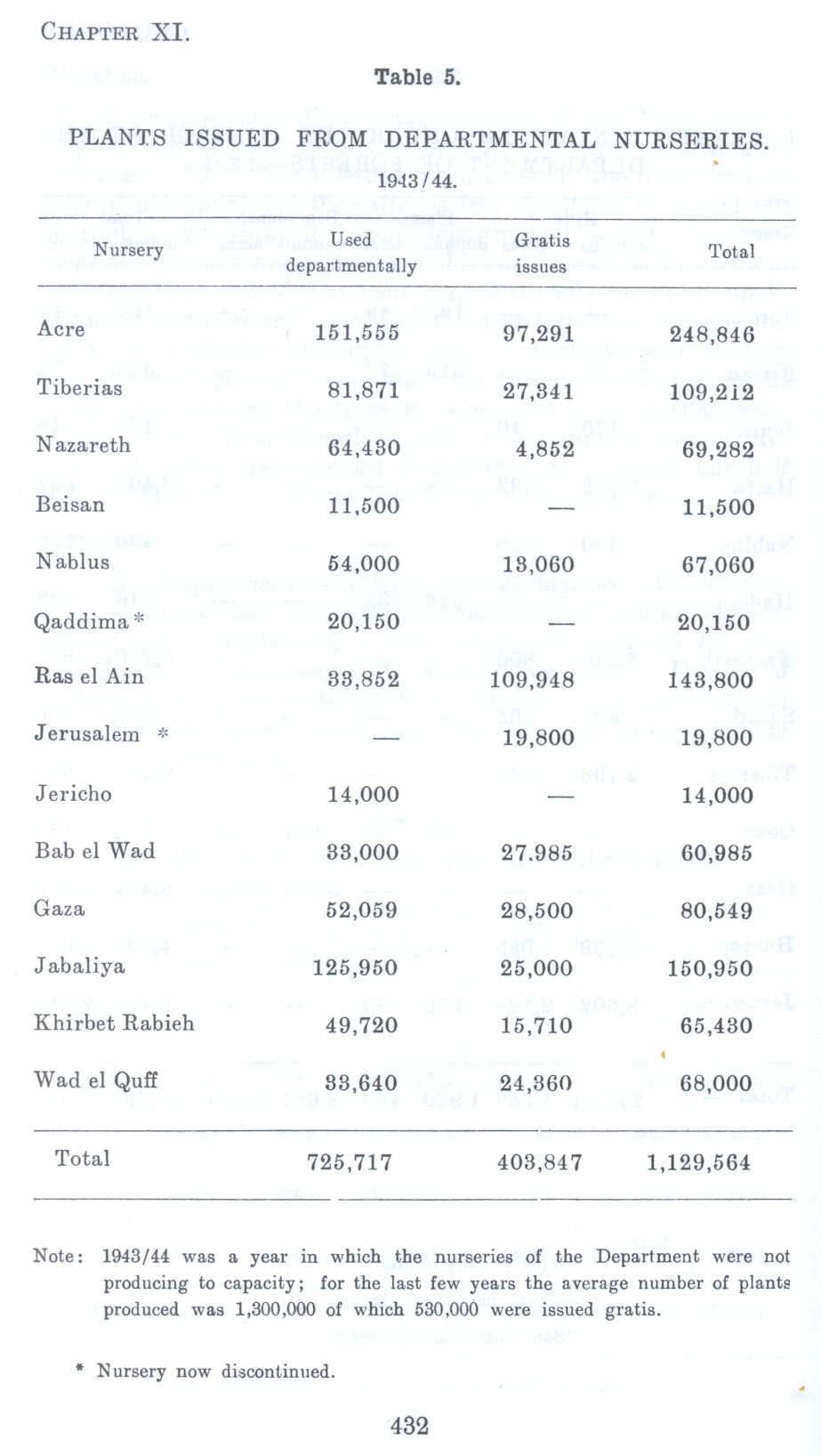 Note: 1943/44 was a year in which the nurseries of the Department were not producing to capacity; for the last few years the average number of plants produced was 1,300,000 of which 530,000 were issued gratis.