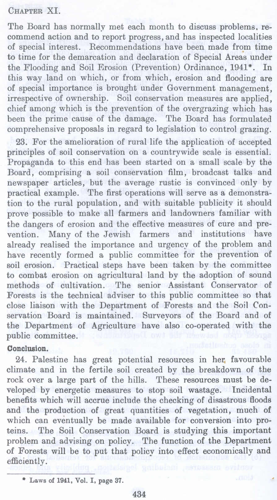 24. Palestine has great potential resources in her, favourable climate and in the fertile soil created by the breakdown of the rock over a large part of the bills. These resources must be developed by energetic measures to stop soil wastage. Incidental benefits which will accrue include the checking of disastrous floods and the production of great quantities of vegetation, much of which can eventually be made available for conversion into proteins. The Soil Conservation Board is studying this important problem and advising on policy. The function of the Department of Forests will be to put that policy into effect economically and efficiently.