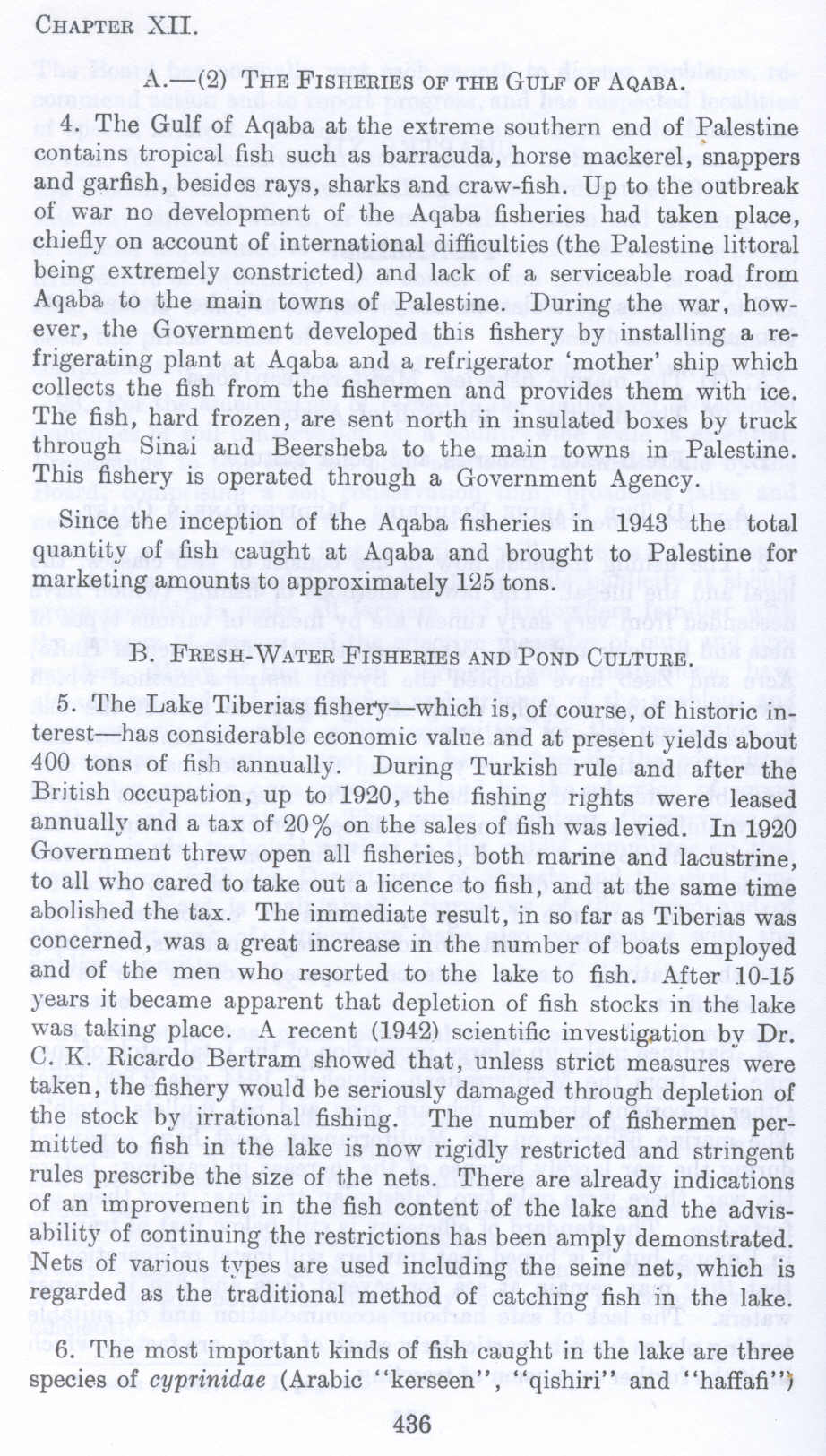 5. The Lake Tiberias fishery-which is, of course, of historic interest-has considerable economic value and at present yields about 400 tons of fish annually. During Turkish rule and after the British occupation, up to 1920, the fishing rights were leased annually and a tax of 20% on the sales of fish was levied. In 1920 Government threw open all fisheries, both marine and lacustrine, to all who cared to take out a licence to fish, and at the same time abolished the tax. The immediate result, in so far as Tiberias was concerned, was a great increase in the number of boats employed and of the men who resorted to the lake to fish. After 10-15 years it became apparent that depletion of fish stocks ill the lake was taking place. A recent (1942) scientific investigation by Dr. C. K. Ricardo Bertram showed that, unless strict measures were taken, the fishery would be seriously damaged through depletion of the stock by irrational fishing. The number of fishermen permitted to fish in the lake is now rigidly restricted and stringent rules prescribe the size of the nets. There are already indications of an improvement in the fish content of the lake and the advisability of continuing the restrictions has been amply demonstrated. Nets of various types are used including the seine net, which is regarded as the traditional method of catching fish in the lake.