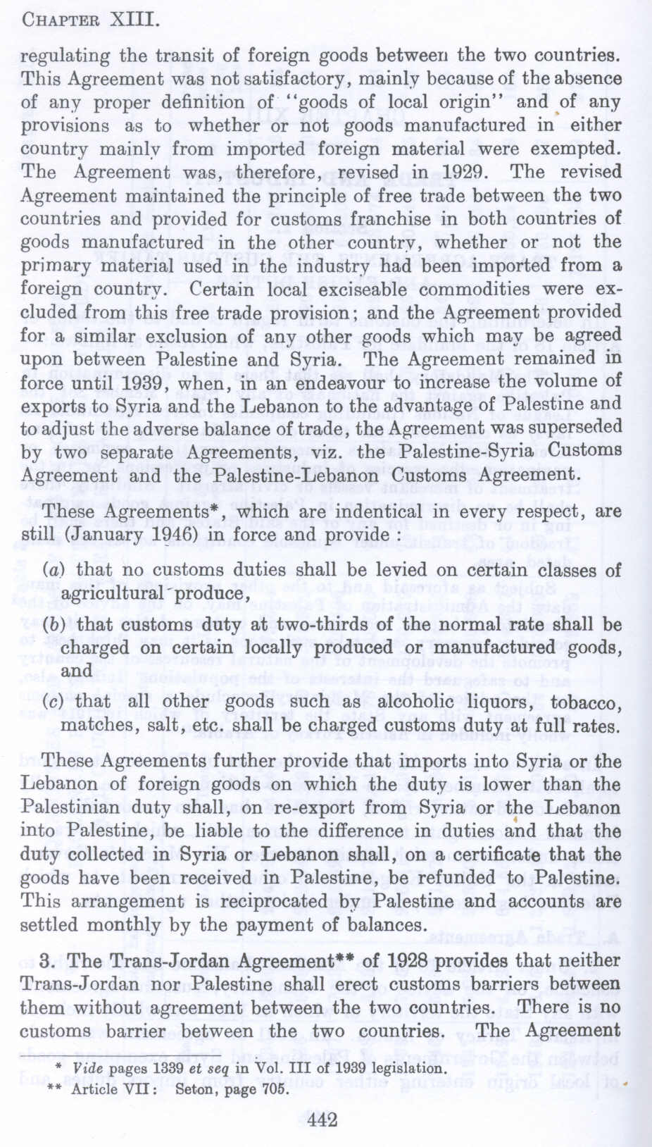 3. The Trans-Jordan Agreement** of 1928 provides that neither Trans-Jordan nor Palestine shall erect customs barriers between them without agreement between the two countries. There is no customs barrier between the two countries. The Agreement