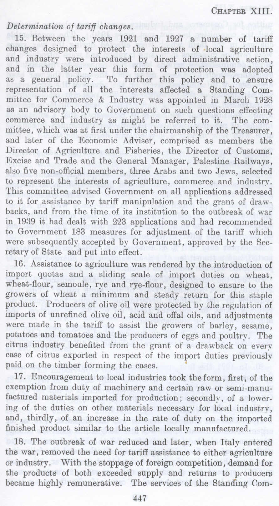 15. Between the years 1921 and 1927 a number of tariff changes designed to protect the interests of local agriculture and industry were introduced by direct administrative action, and in the latter year this form of protection was adopted as a general policy. To further this policy and to .ensure representation of all the interests affected a Standing Committee for Commerce & Industry was appointed in March 1928 as an advisory body to Government on such questions effecting commerce and industry as might be referred to it. The committee, which was at first under the chairmanship of the Treasurer, and later of the Economic Adviser, comprised as members the Director of Agriculture and Fisheries, the Director of Customs, Excise and Trade and the General Manager, Palestine Railways, also five non-official members, three Arabs and two Jews, selected to represent the interests of agriculture, commerce and industry. This committee advised Government on all applications addressed to it for assistance by tariff manipulation and the grant of drawbacks, and from the time of its institution to the outbreak of war in Hl39 it had dealt with 223 applications and had recommended to Government 183 measures for adjustment of the tariff which were subsequently accepted by Government, approved by the Secretary of State and put into effect.