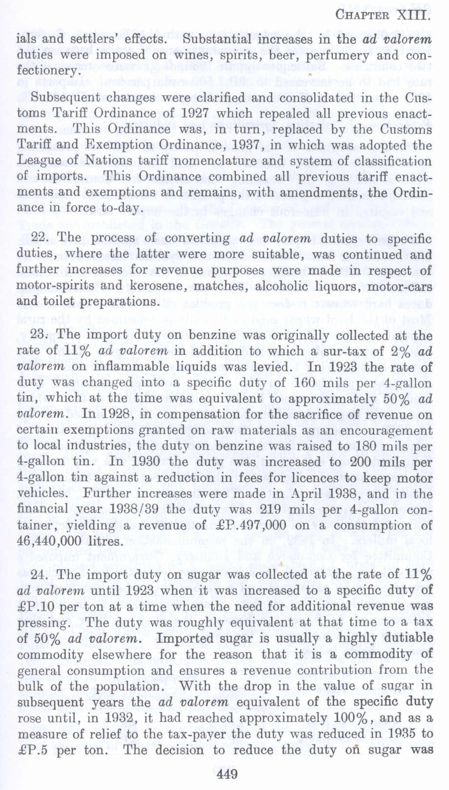 24. The import duty on sugar was collected at the rate of 11 % ad valnrem until 1923 when it was increased to a specific duty of £P .10 per ton at a time when the need for additional revenue was pressing. The duty was roughly equivalent at that time to a tax of 50 % ad valor em. Imported sugar is usually a highly dutiable commodity elsewhere for the reason that it is a commodity of general consumption and ensures a revenue contribution from the bulk of the population. With the drop in the value of sugar in subsequent years the ad valorem equivalent of the specific duty rose until, in 1932, it had reached approximately 100%, and as a measure of relief to the tax-payer the duty was reduced in 1935 to £P.5 per ton. The decision to reduce the duty on sugar was