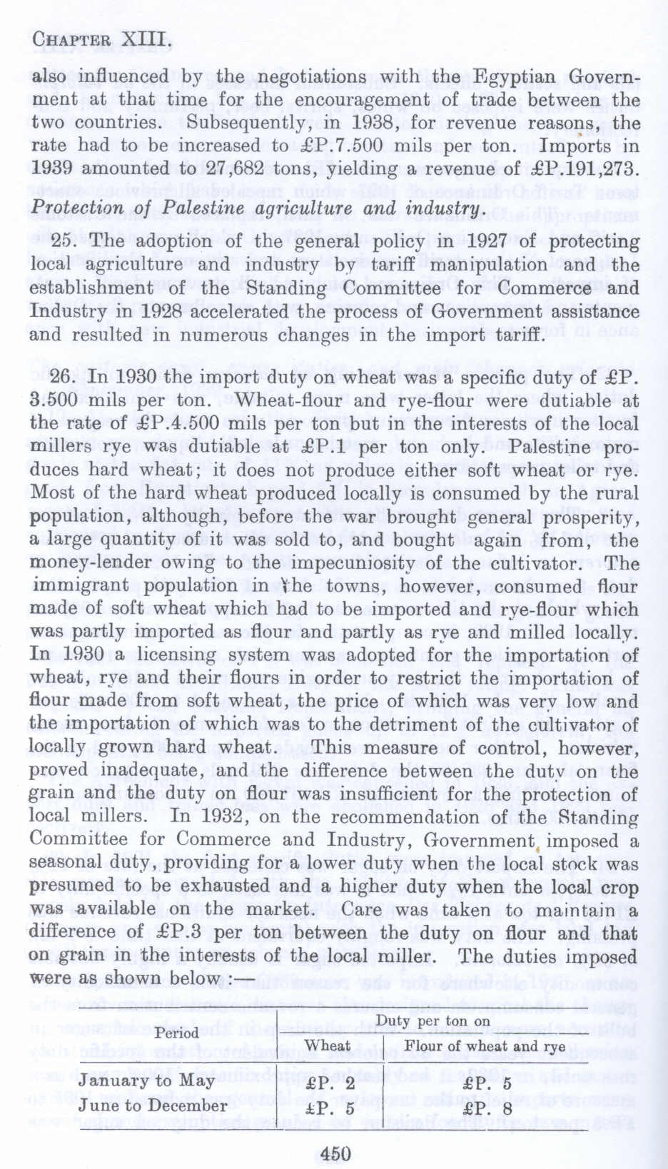 26. In 1930 the import duty on wheat was a specific duty of £P. 3.500 mils per ton. Wheat-flour and rye-flour were dutiable at the rate of £P .4.500 mils per ton but in the interests of the local millers rye was dutiable at £P .1 per ton only. Palestine produces bard wheat; it does not produce either soft wheat or rye. Most of the hard wheat produced locally is consumed by the rural population, although, before the war brought general prosperity, a large quantity of it was sold to, and bought again from, the money-lender owing to the impecuniosity of the cultivator. The immigrant population in the towns, however, consumed flour made of soft wheat which had to be imported and rye-flour which was partly imported as flour and partly as rye and milled locally. In 1930 a licensing system was adopted for the importation of wheat, rye and their flours in order to restrict the importation of flour made from soft wheat, the price of which was very low and the importation of which was to the detriment of the cultivator of locally grown hard wheat. This measure of control, however, proved inadequate, and the difference between the duty on the grain and the duty on flour was insufficient for the protection of local millers. In 1932, on the recommendation of the Standing Committee for Commerce and Industry, Government, imposed a seasonal duty, providing for a lower duty when the local stock was presumed to be exhausted and a higher duty when the local crop was .available on the market. Care was taken to maintain a difference of £P .3 per ton between the duty on flour and that on grain in the interests of the local miller. The duties imposed were as shown below :-