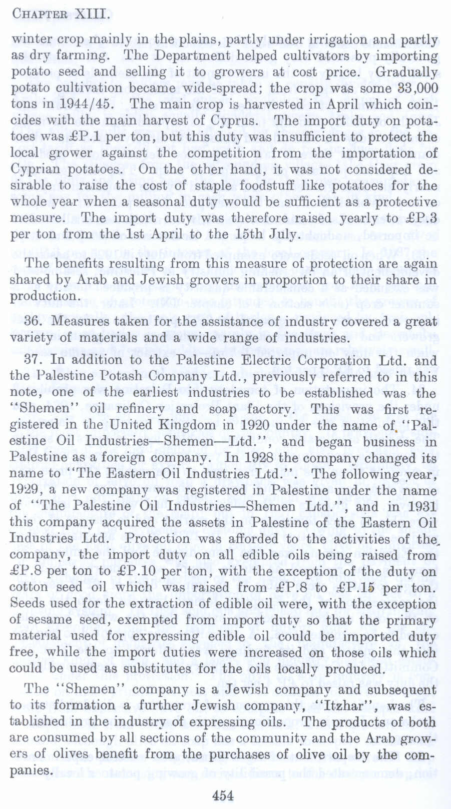 37. In addition to the Palestine Electric Corporation Ltd. and the Palestine Potash Company Ltd., previously referred to in this note, one of the earliest industries to be established was the "Shemen" oil refinery and soap factory. This was first registered in the United Kingdom in 1920 under the name of. "Palestine Oil Industries-Shemen-Ltd.", and began business in Palestine as a foreign company. In 1928 the company changed its name to "The Eastern Oil Industries Ltd.". The following year, 1929, a new company was registered in Palestine under the name of "The Palestine Oil Industries-e-Shemen Ltd.", and in 1931 this company acquired the assets in Palestine of the Eastern Oil Industries Ltd. Protection was afforded to the activities of the, com pan>', the import duty on all edible oils being raised from £1'.8 per ton to £P.10 per ton, with the exception of the duty on cotton seed oil which was raised from £P.8 to £P.15 per ton. Seeds used for the extraction of edible oil were, with the exception of sesame seed, exempted from import duty so that the primary material used for expressing edible oil could be imported duty free, while the import duties were increased on those oils which could be used as substitutes for the oils locally produced.