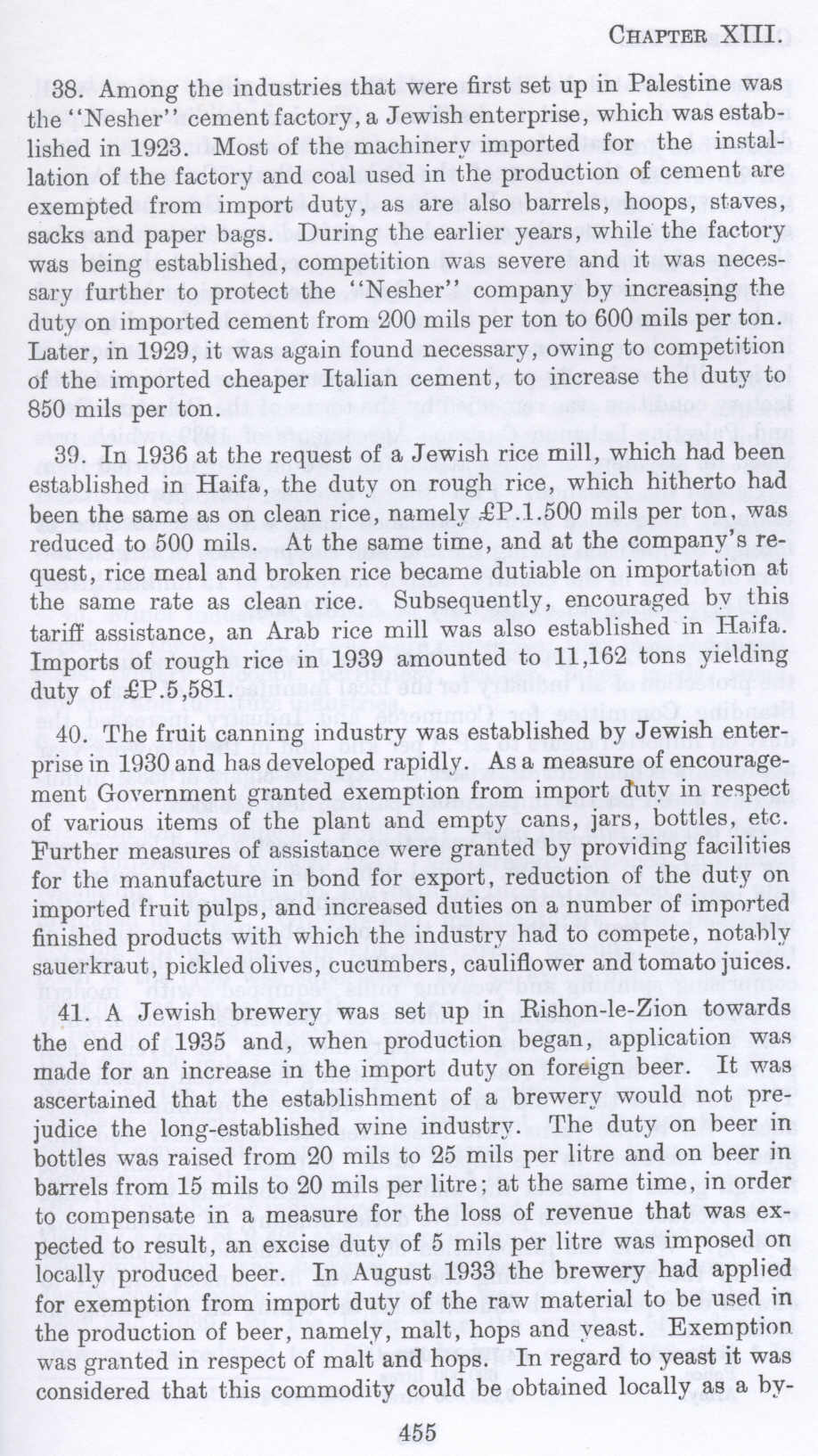 38. Among the industries that were first set up in Palestine was the "Nesher" cement factory, a Jewish enterprise, which was established in 1923. Most of the machinery imported for the installation of the factory and coal used in the production of cement are exempted from import duty, as are also barrels, hoops, staves, sacks and paper bags. During the earlier years, while the factory was being established, competition was severe and it was necessary further to protect the "Nesher" company by increasing the duty on imported cement from 200 mils per ton to 600 mils per ton. Later, in 1929, it was again found necessary, owing to competition of the imported cheaper Italian cement, to increase the duty to 850 mils per ton.