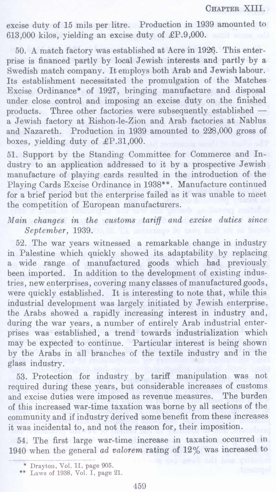 51. Support by the Standing Committee for Commerce and Industry to an application addressed to it by a prospective Jewish manufacture of playing cards resulted in the introduction of the Playing Cards Excise Ordinance in 1938**. Manufacture continued for a brief period but the enterprise failed as it was unable to meet the competition of European manufacturers.