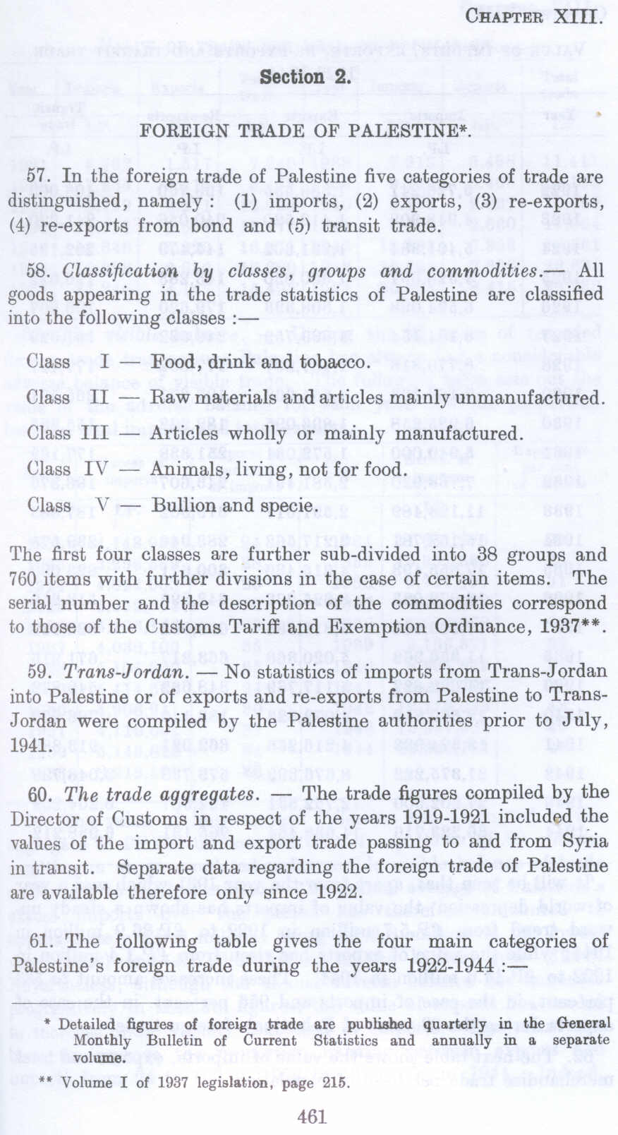 60. The trade aggregates. - The trade figures compiled by the Director of Customs in respect of the years 1919-1921 included the values of the import and export trade passing to and from Syria in transit. Separate data regarding the foreign trade of Palestine are available therefore only since 1922.