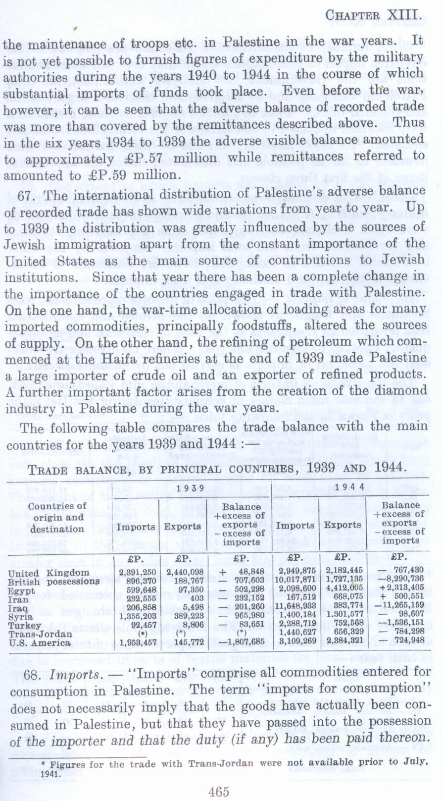67. The international distribution of Palestine's adverse balance of recorded trade has shown wide variations from year to year. Up to 1939 the distribution was greatly influenced by the sources of Jewish immigration apart from the constant importance of the United States as the main source of contributions to Jewish institutions. Since that year there has been a complete change in the importance of the countries engaged in trade with Palestine. On the one hand, the war-time allocation of loading areas for many imported commodities, principally foodstuffs, altered the sources of supply. On the other hand, the refining of petroleum which commenced at the Haifa refineries at the end of 1939 made Palestine a large importer of crude oil and an exporter of refined products. A further important factor arises from the creation of the diamond industry in Palestine during the war years.
