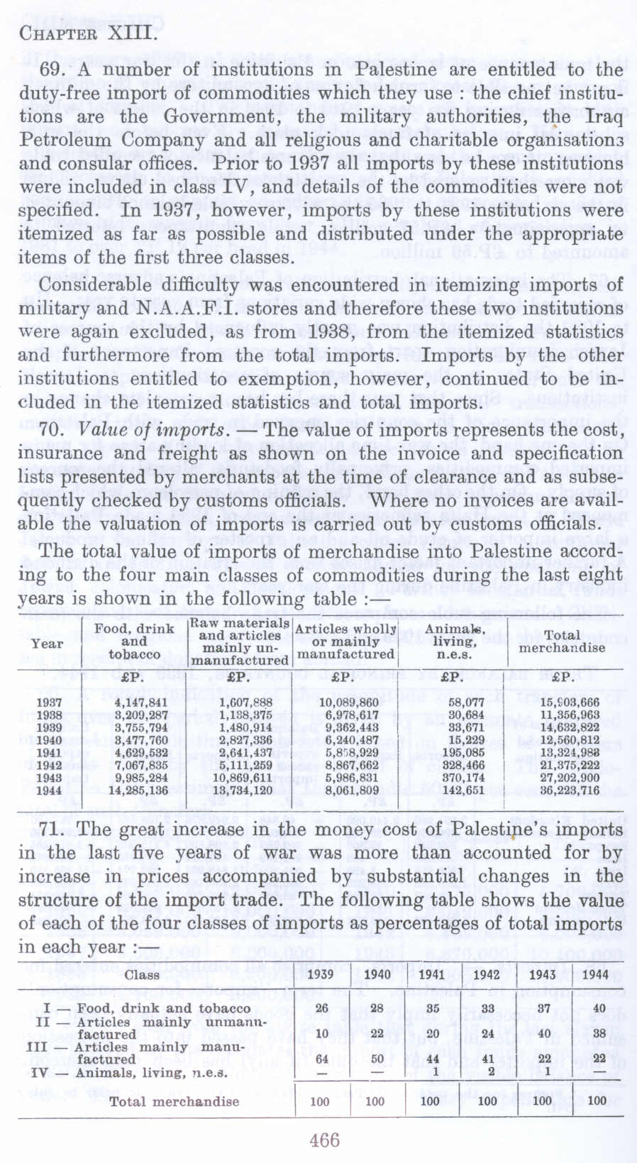 69. A number of institutions in Palestine are entitled to the duty-free import of commodities which they use : the chief institutions are the Government, the military authorities, t[Je Iraq Petroleum Company and all religious and charitable organisations and consular offices. Prior to 1937 all imports by these institutions were included in class IV, and details of the commodities were not specified. In 1937, however, imports by these institutions were itemized as far as possible and distributed under the appropriate items of the first three classes.