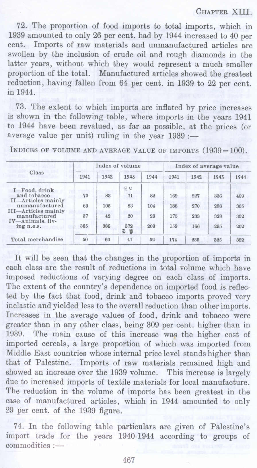 74. In the following table particulars are given of Palestine's import trade for the years 1940-1944 according to groups of commodities :-