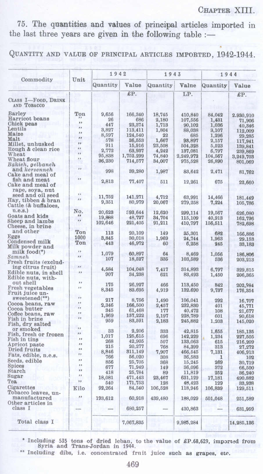 * Including 535 tons of dried leban, to the value of .£P.68,629, imported from Syria and Trans-Jordan in 1944.