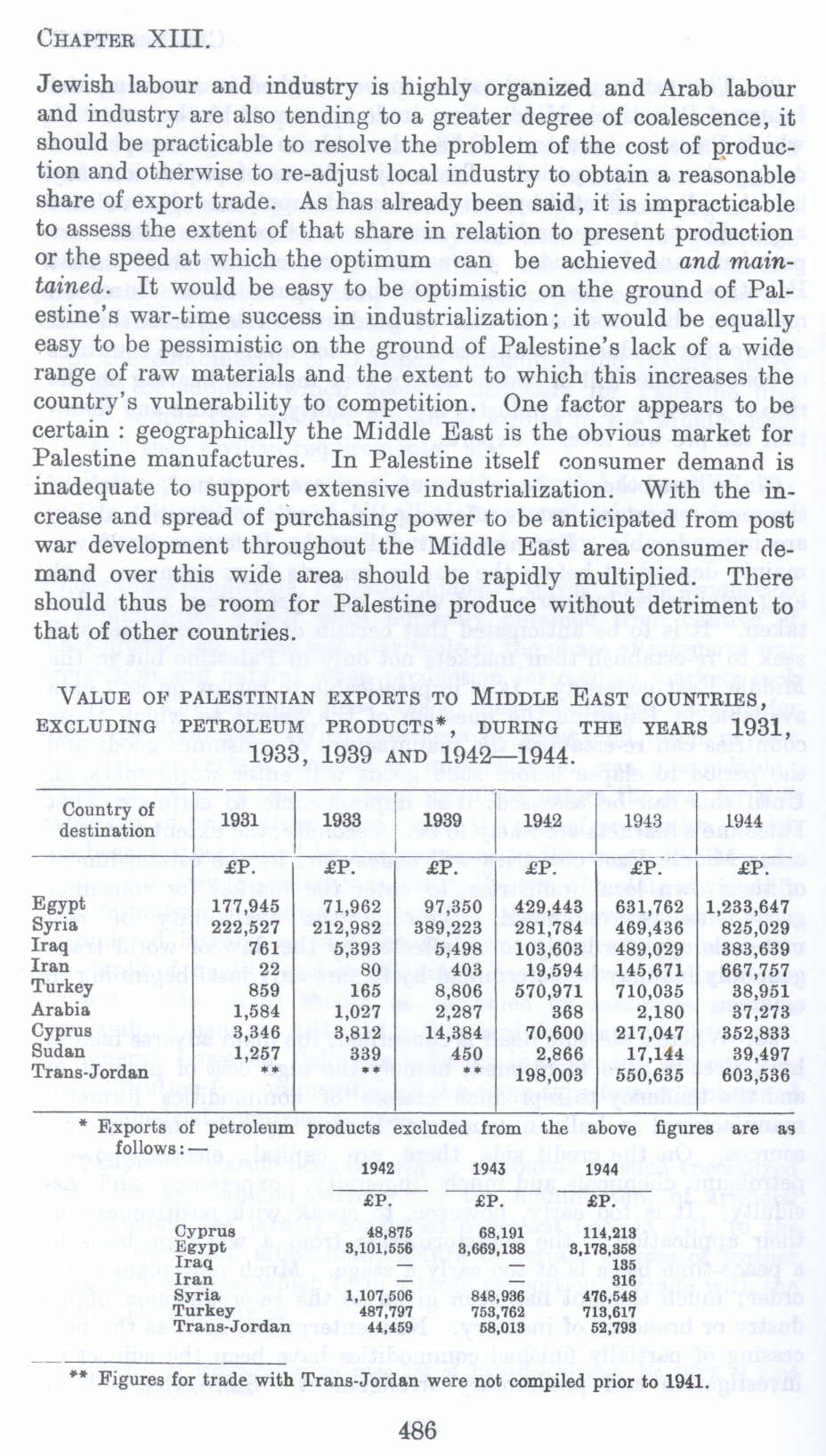 Palestine's Trade With Middle Eastern Countries: Value of Palestinian Exports to Middle East Countries, Excluding Petroleum Products before 1948 (Nakba), British Mandate: A Survey of Palestine: Volume I - Page 486. Chapter XIII: Section 3 |