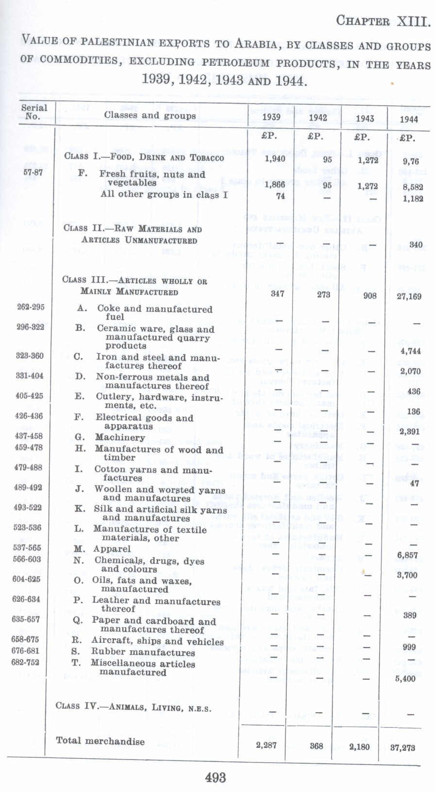 Palestine's Trade With Saudi Arabia: Value of Palestinian Exports To Saudi Arabia, By Classes and Groups of Commodities, Excluding Petroleum in the years of 1939, 1942, 1943, and 1944 before 1948 (Nakba), British Mandate: A Survey of Palestine: Volume I - Page 493. Chapter XIII: Section 3