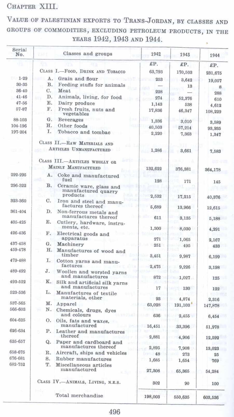 Palestine's Trade With Trans-Jordan: Value of Palestinian Exports To Trans-Jordan, By Classes and Groups of Commodities, Excluding Petroleum in the years of 1939, 1942, 1943, and 1944 before 1948 (Nakba), British Mandate: A Survey of Palestine: Volume I - Page 496. Chapter XIII: Section 3