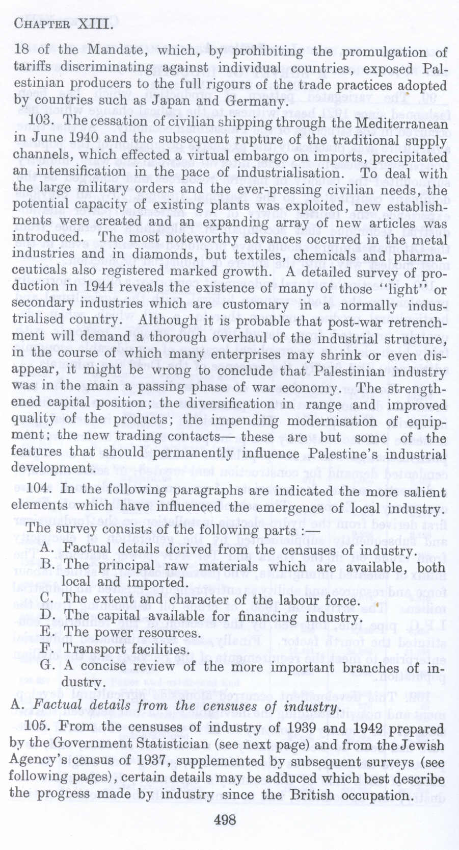 105. From the censuses of industry of 1939 and 1942 prepared by the Government Statistician (see next page) and from the Jewish Agency's census of 1937, supplemented by subsequent surveys (see following pages), certain details may be adduced which best describe the progress made by industry since the British occupation.