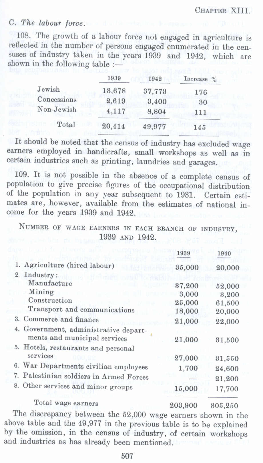 A Survey of Palestinian Industry: The Labor Force before 1948 (Nakba). NUMBER OF WAGE EARNERS IN EACH BRANCH OF INDUSTRY, 1939 AND 1942 before Nakba. British Mandate: A Survey of Palestine: Volume I - Page 507. Chapter XIII: Section 4 |